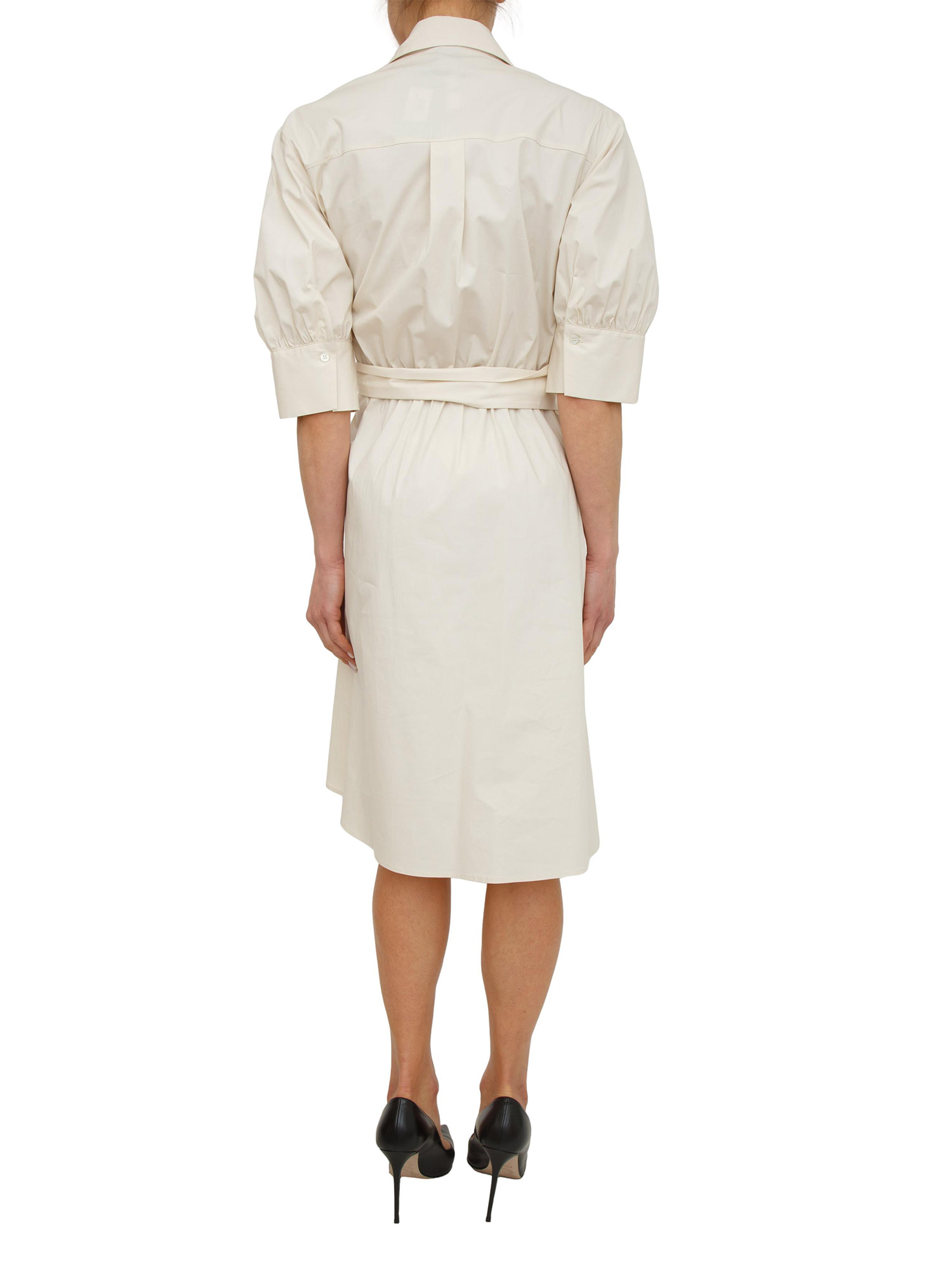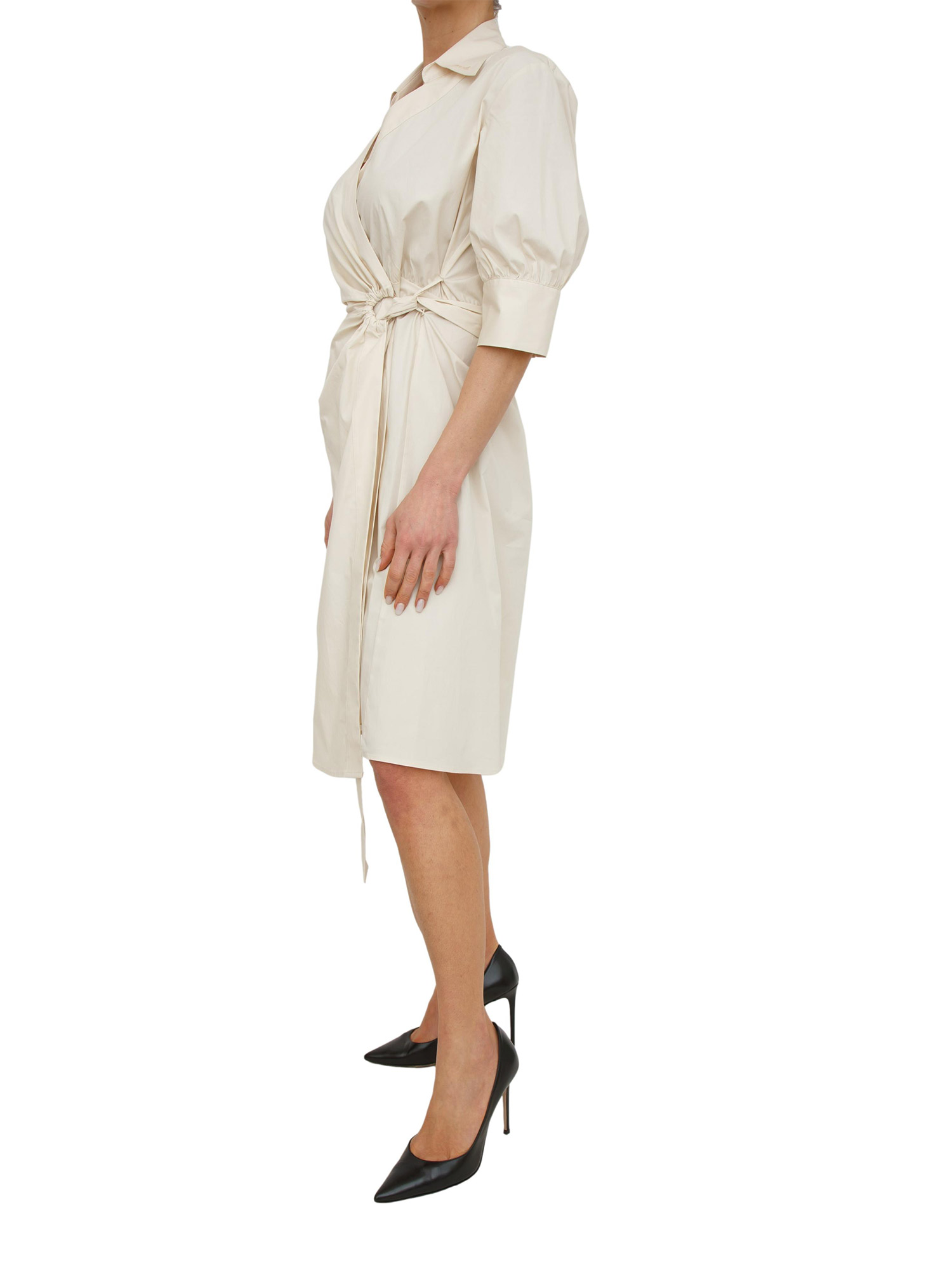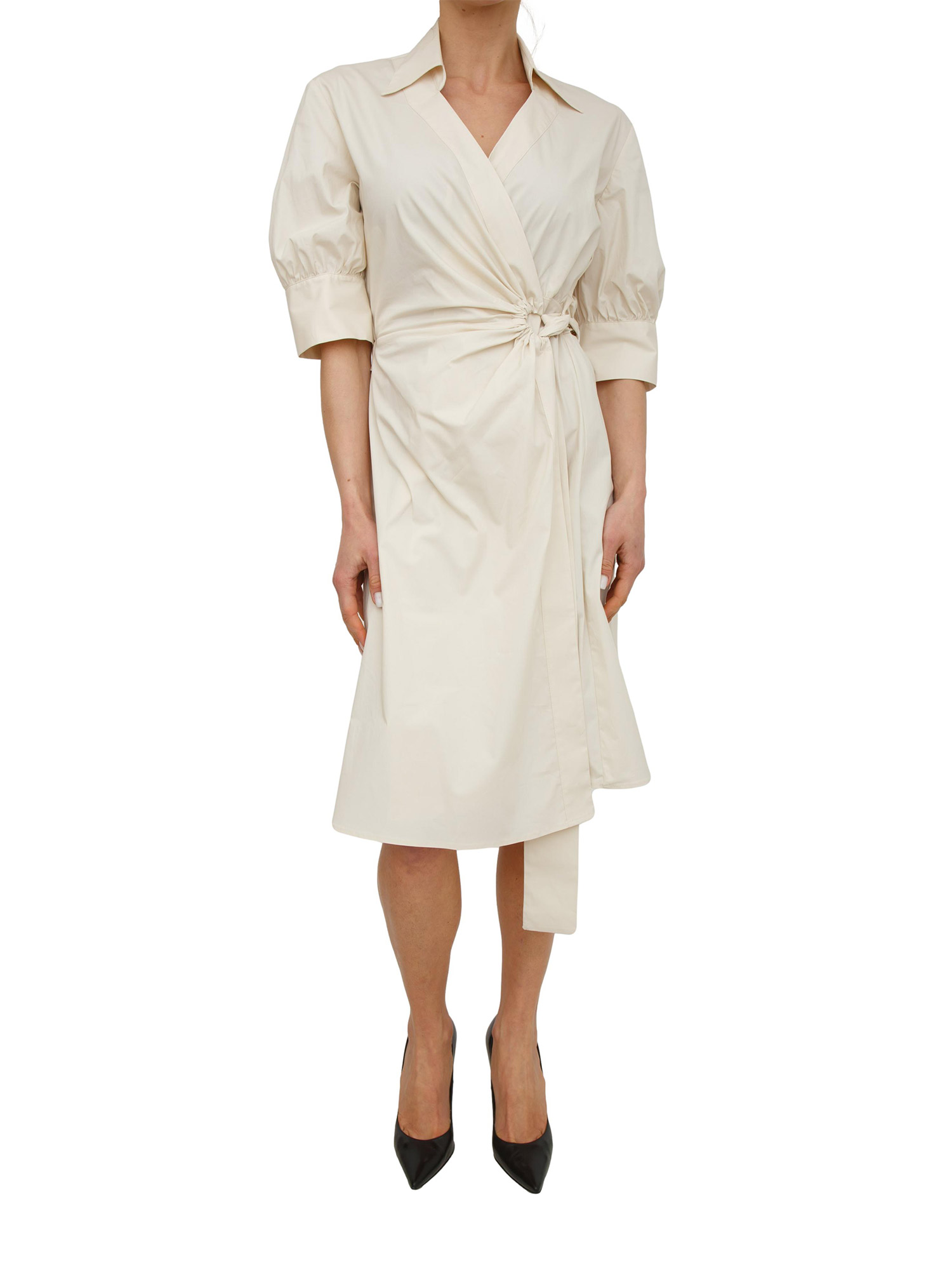 Abito Alinea Pinko realizzato in morbido e fresco cotone con chiusura a portafoglio. Ampie mezze maniche, colletto a camicia e cintura in vita da passare sull'anello per indossarlo. Semplice e raffinato. La modella è alta 1.72 e indossa la taglia 40.