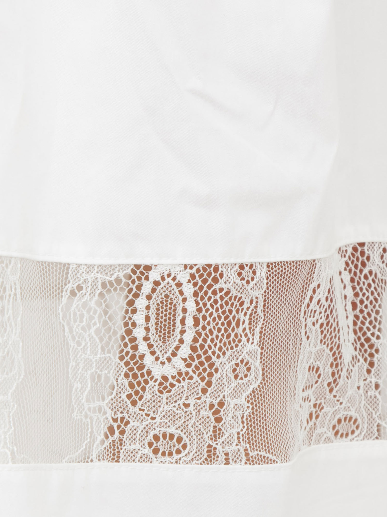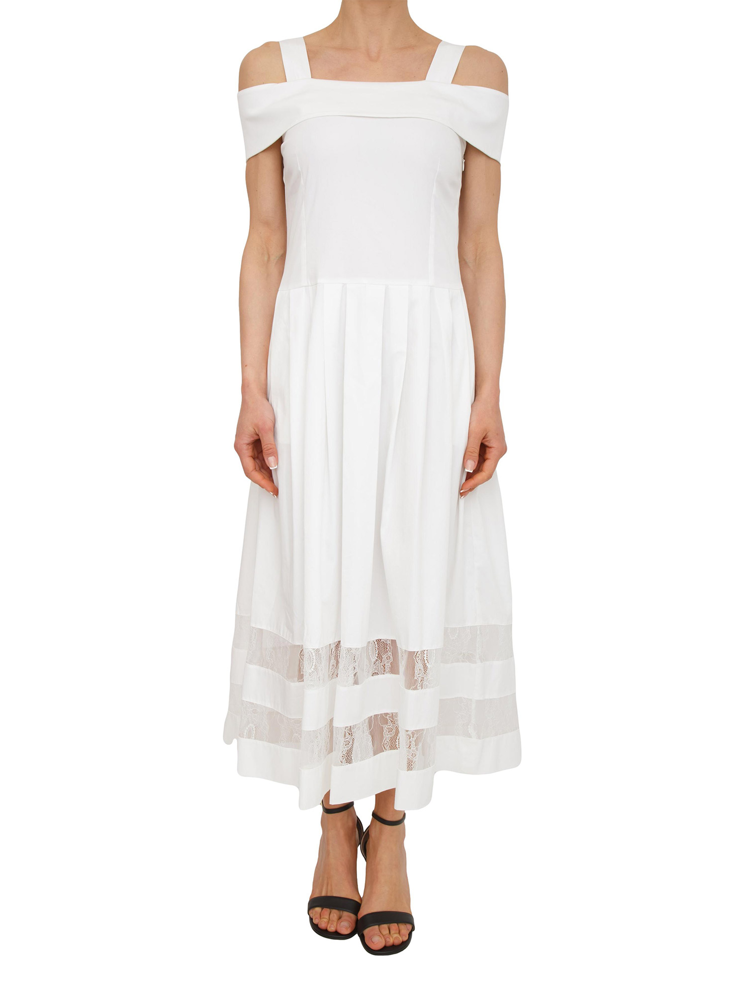 Per le tue occasioni speciali puoi contare sull'abito midi in misto cotone con inserti in pizzo floreale in trasparenza. Design con collo off shoulder con spalline, taglio in vita e gonna morbida con arricciatura. Sandali flat o tacchi alti a seconda del mood. La modella è alta 1.72 e indossa la taglia 40.