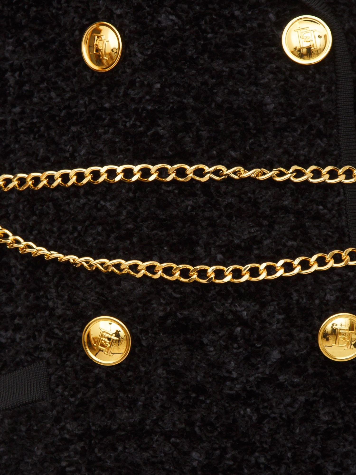 Abito Elisabetta Franchi in ciniglia bouclé dalla vestibilità aderente. Spalle strutturate e collo rever con chiusura doppiopetto e tasche applicate al fondo. Arricchito da bottoni e cintura con charm a forma di mini-bag logata. La modella è alta 1.72 e indossa la taglia 38.