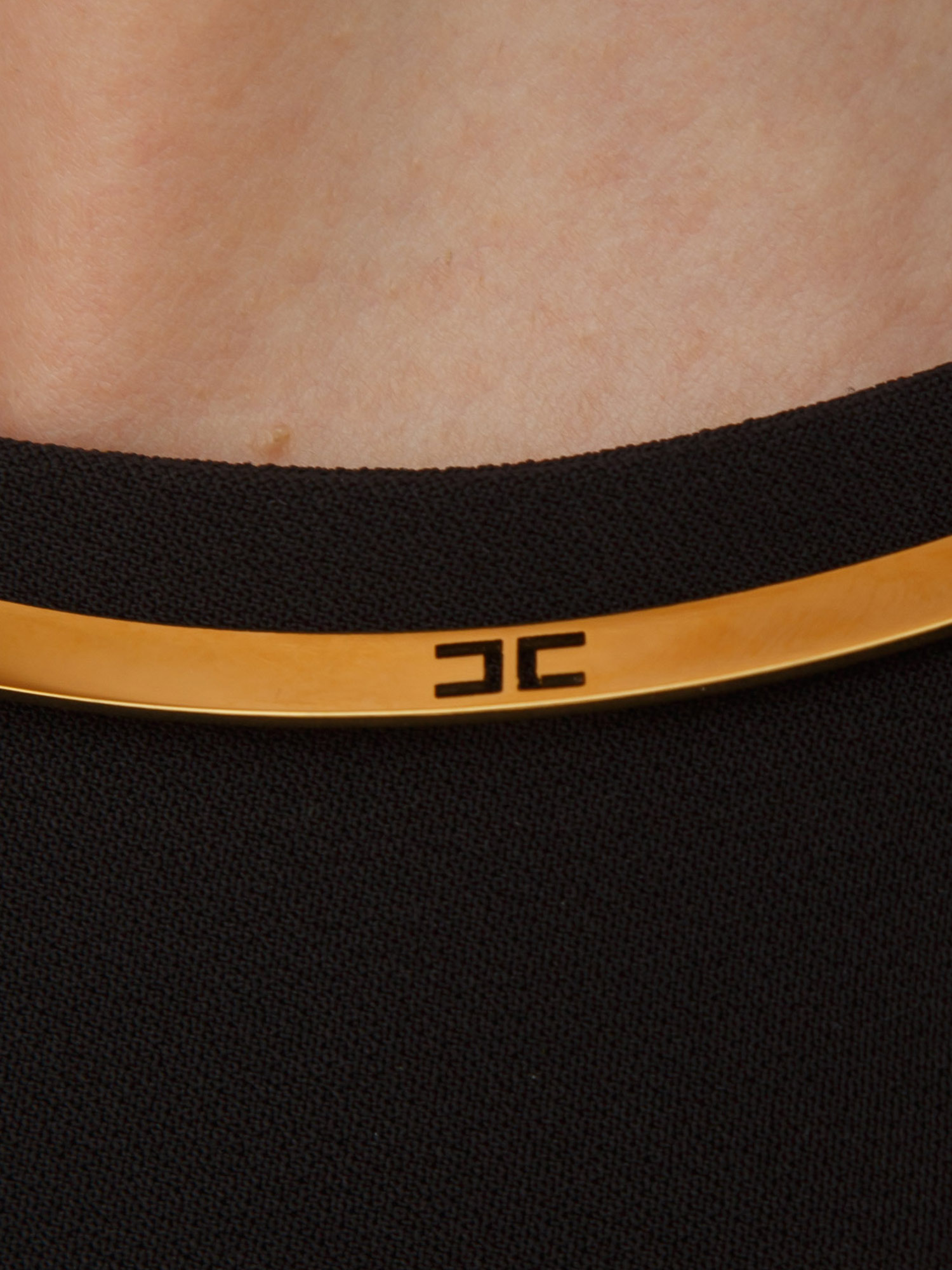 Abito Elisabetta Franchi in crêpe leggero dalla vestibilità aderente. Il vestito ha gonna midi e scollo olimpionico che mette in evidenza le spalle. Una placca in metallo dorato con logo lo impreziosisce sullo scollo. La modella è alta 1.72 e indossa la taglia 40.