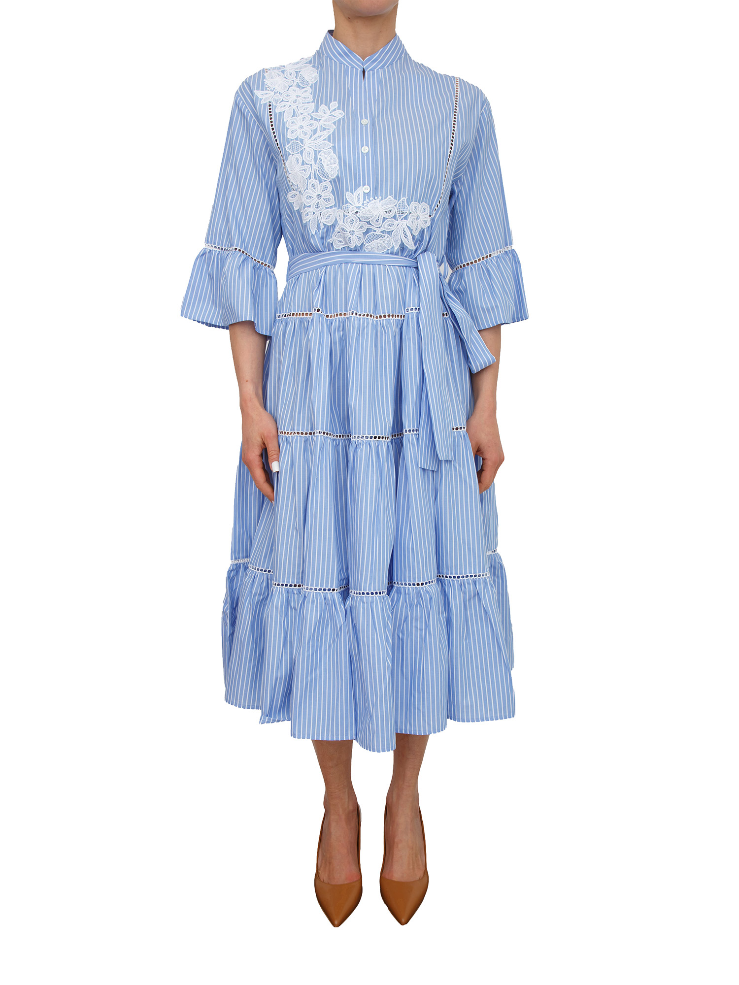 Abito Ermanno Firenze in popeline di misto cotone a camicia con collo coreano e maniche a kimono. Design stupendo con pizzo floreale ricamato sul davanti a contrasto. Cinturino in tessuto per esaltare il punto vita e linea ampia con tre balze arricciate. La modella è alta 1.72 e indossa la taglia XS.