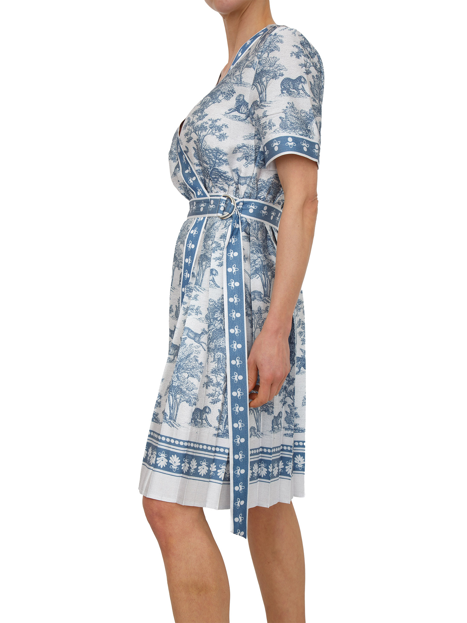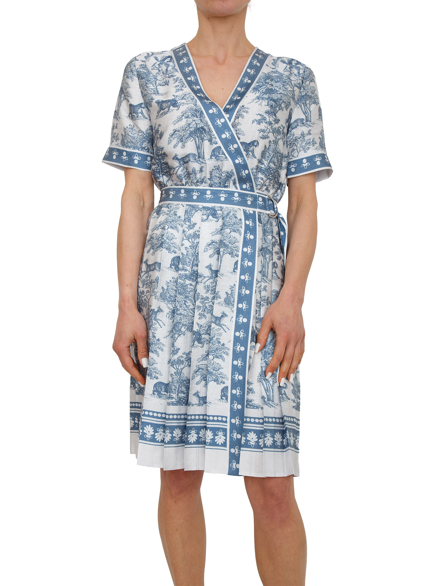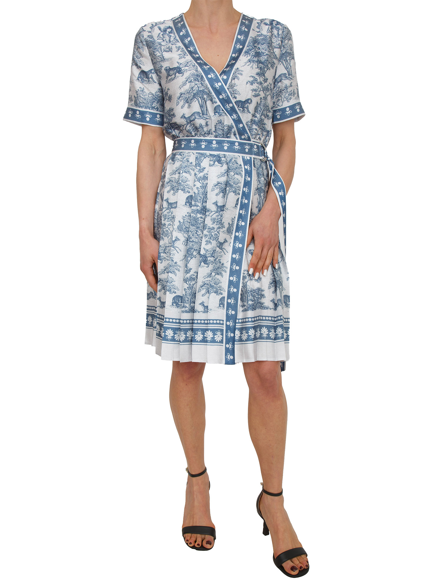 Abito Fracomina in morbidissimo tessuto con stampa esotica a contrasto. Design con chiusura a portafoglio, scollo ad incrocio ed apertura laterale con fusciacca. La modella è alta 1.72 e indossa la taglia XS.