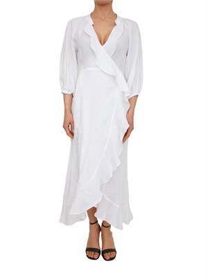 Con la sua linea incrociata enfatizzata dai volant, questo abito Gioco di Marella realizzato in puro lino strizza l'occhio alla bella stagione e offre un look tutto femminile. I volumi morbidi della gonna e delle maniche aggiungono una nota romantica. La modella è alta 1.72 e indossa la taglia 38.