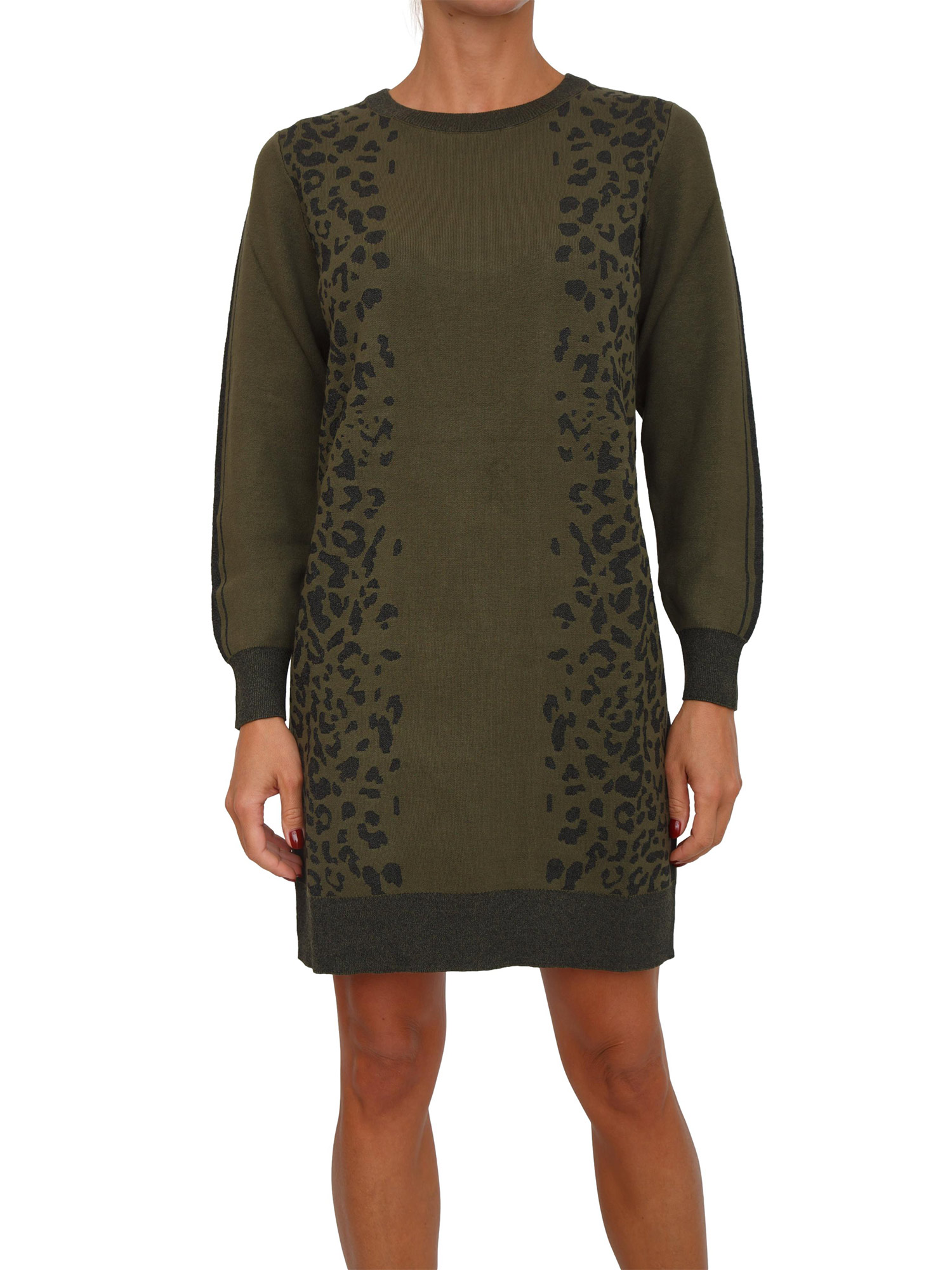 Abito in maglia di misto viscosa e lurex con motivo animalier jacquard. Scollo rotondo, maniche lunghe e bordi a costine. La modella è alta 1.72 e indossa la taglia XS.