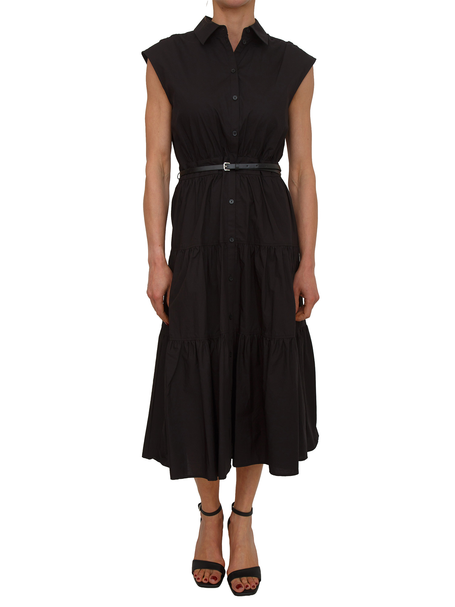 Questo abito chemisier smanicato Michael Michael Kors è versatile e alla moda per l'ufficio e non solo. Realizzato in popeline di cotone biologico traspirante, presenta una vita arricciata e un'ampia gonna a balze. La modella è alta 1.72 e indossa la taglia XS.