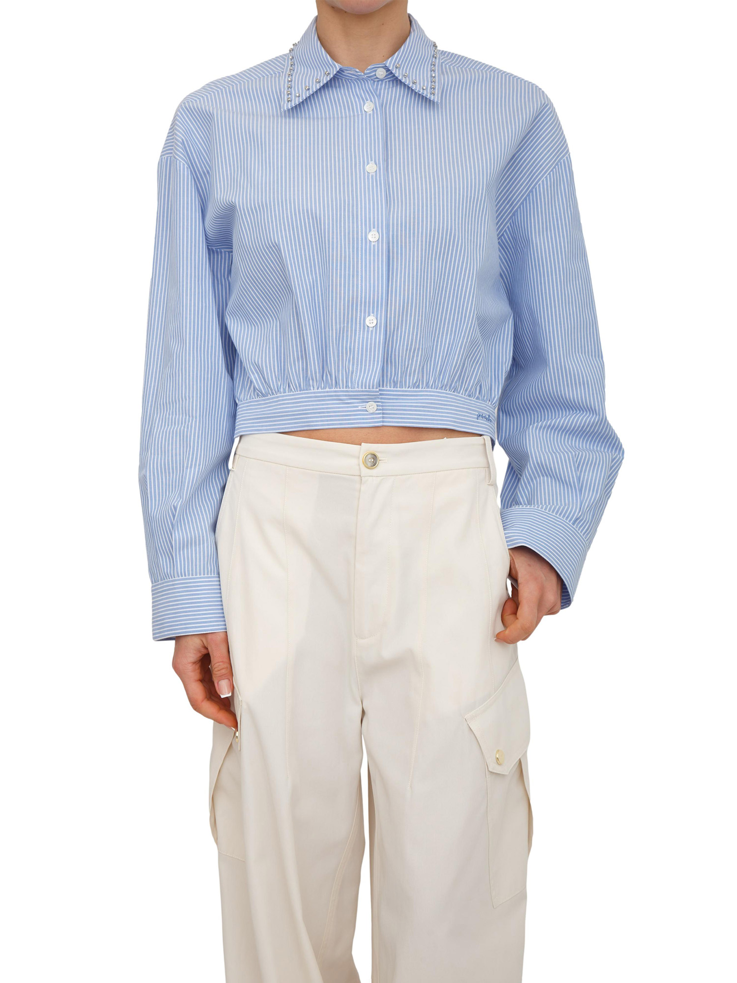 Camicia cropped "Charita" Pinko realizzata in popeline di cotone tinto in filo con colletto classico con borchie, abbottonatura frontale e fondo arricciato con logo lettering ricamato. Design con motivo a righe bianche e azzurre, versatile ma fashion. La modella è alta 1.72 e indossa la taglia 38.