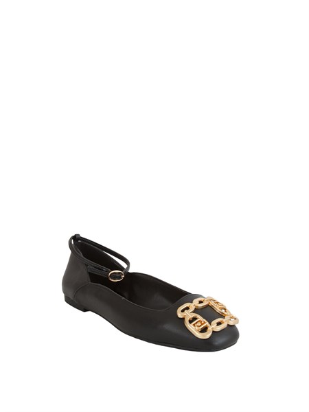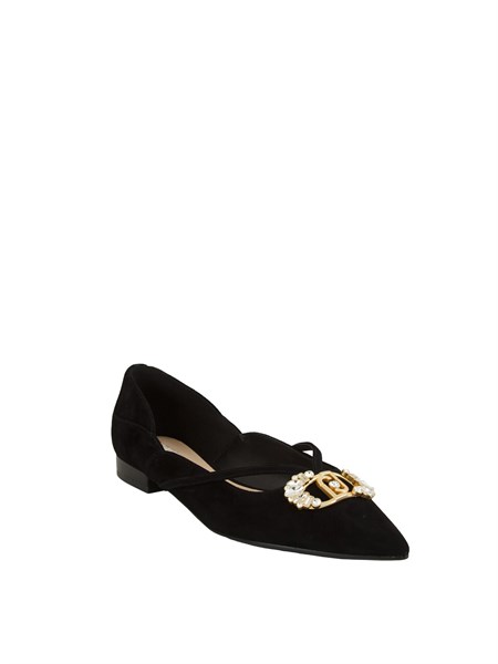Ballerine con tomaia effetto shearling, mini logo monogram, suola super-flat e chiusura con fascette regolabili.