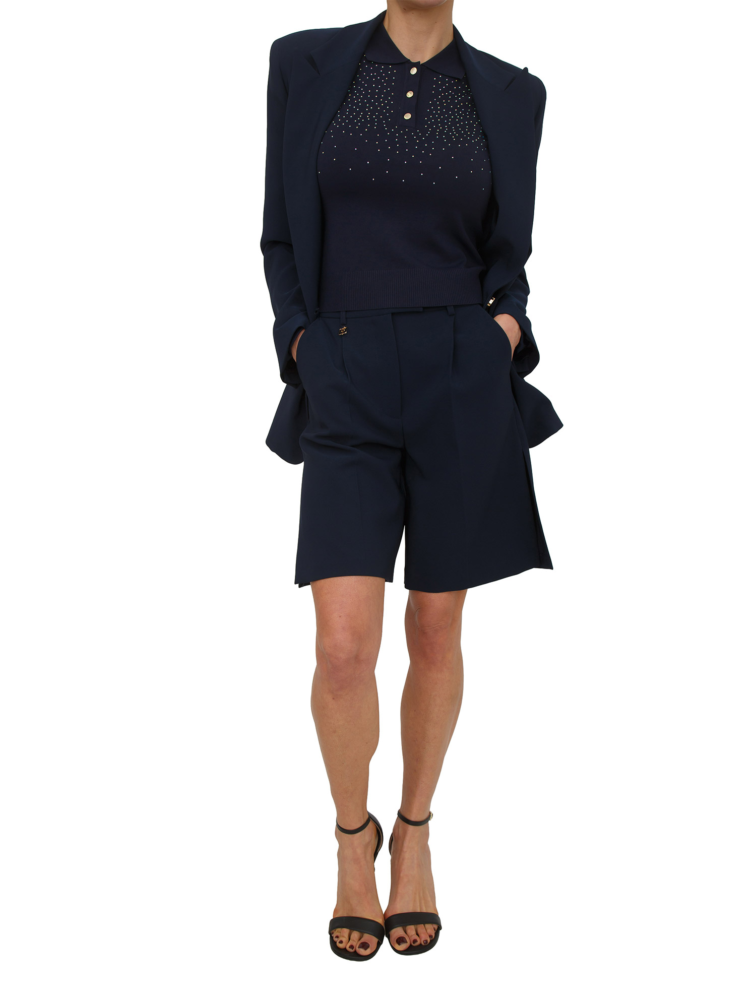 Bermuda Fracomina realizzati in tessuto elastico con spacchi laterali e vita alta. Design dotato di pences, chiusura con zip e gancetto, tasche alla francese laterali e filetto sul retro. Il punto forte è la raffinatezza che offrono in qualsiasi outfit che vorrai. La modella è alta 1.72 e indossa la taglia 40.