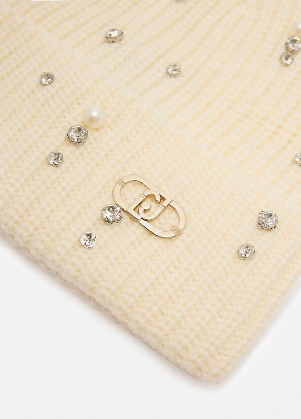 Berretto Liu Jo modello beanie realizzato in maglia a coste con strass e perle applicate. Design con risvolto e logo in metallo.