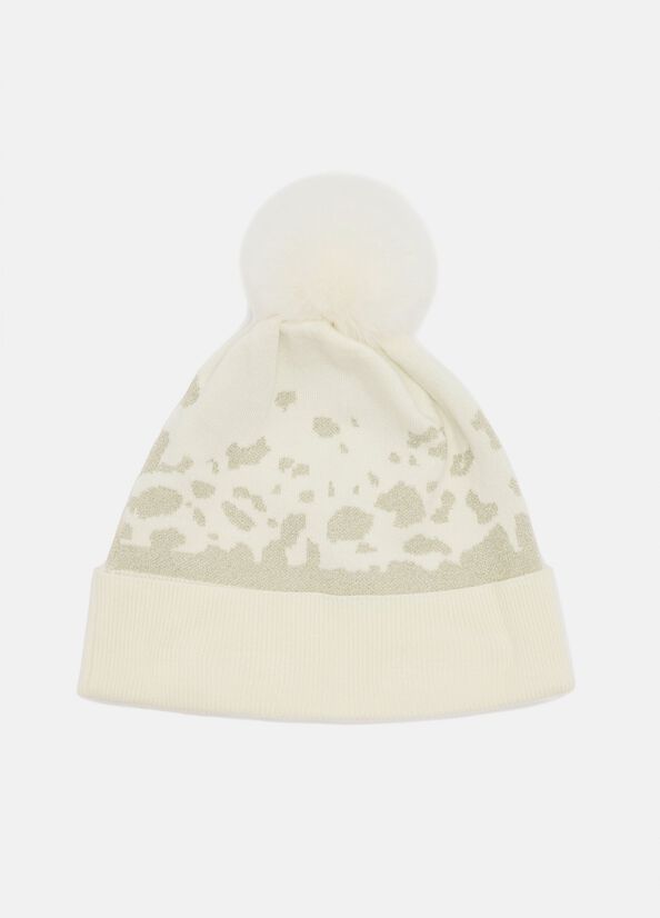 Berretto Liu Jo in viscosa lurex avorio motivo animalier e pompon