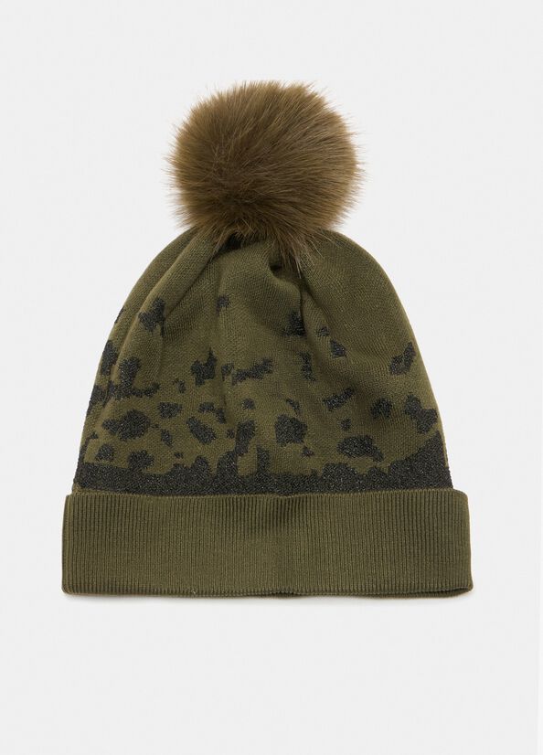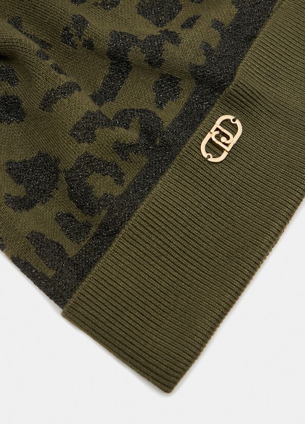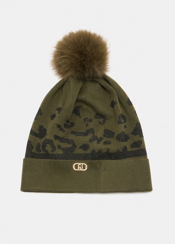 Berretto Liu Jo in viscosa lurex verde motivo animalier e pompon
