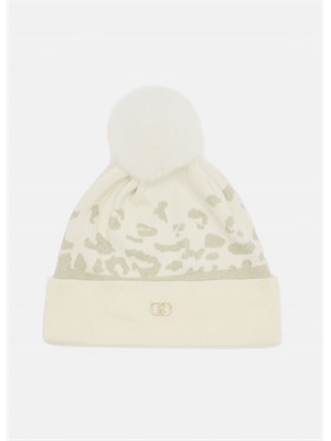 Berretto beanie Liu Jo realizzato in maglia di misto viscosa e lurex con motivo animalier jacquard e pompon. Design con risvolto a costine e logo metallo.