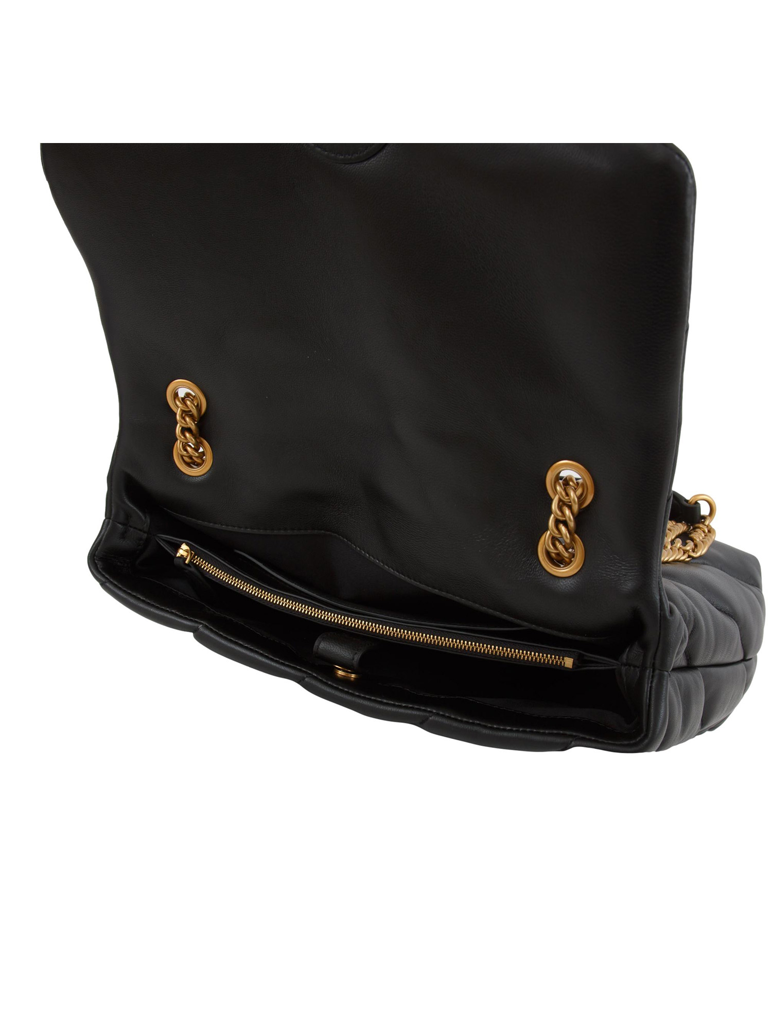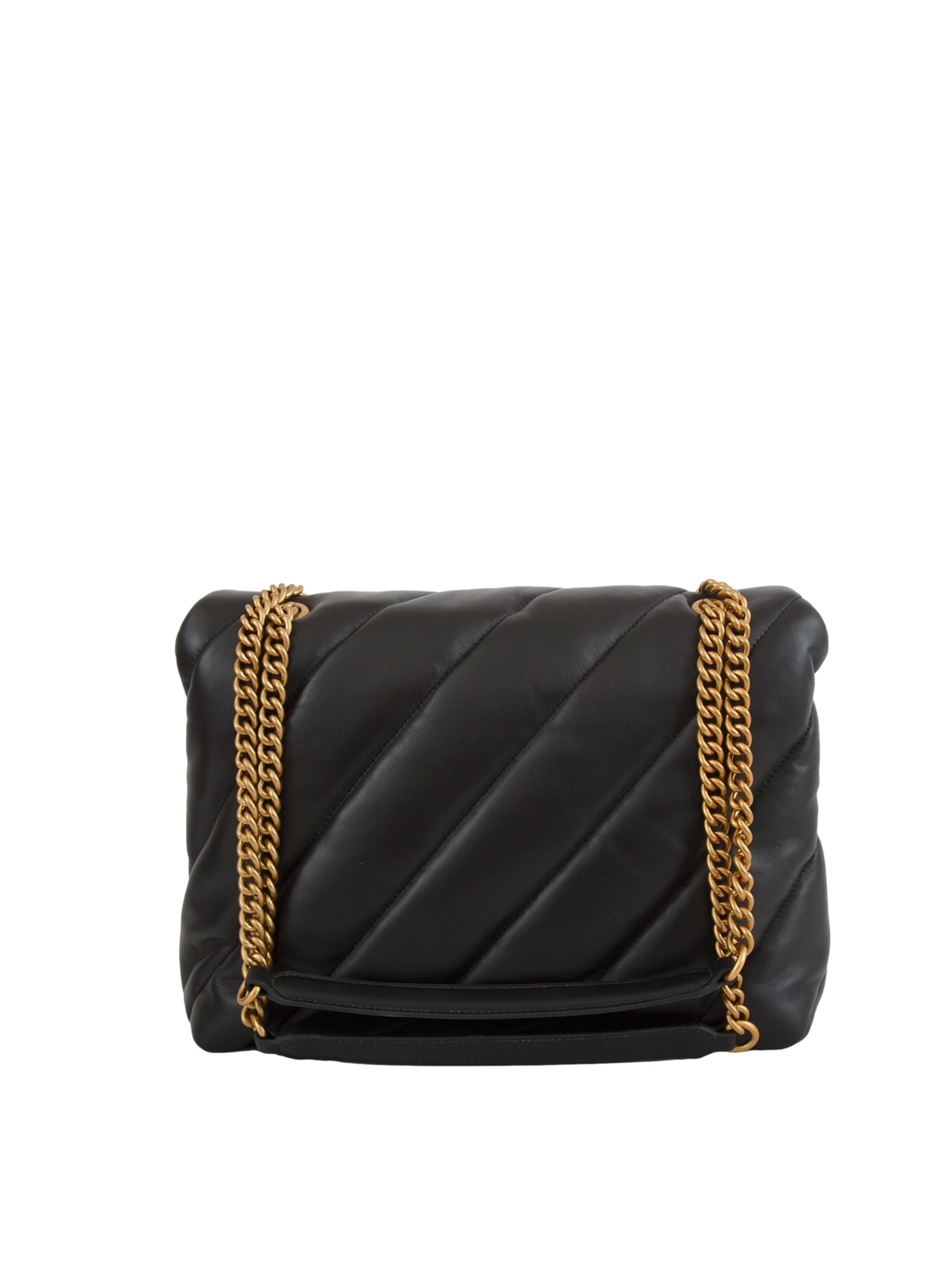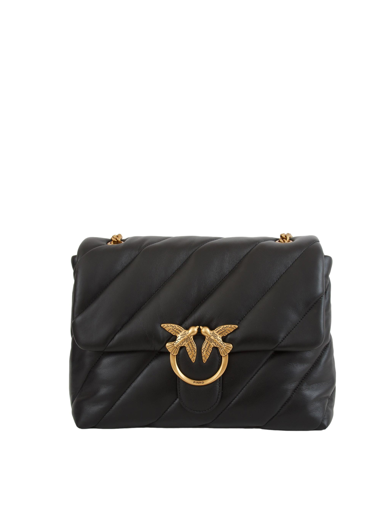Big Love Bag Puff Pinko in morbida nappa con maxi trapuntatura obliqua. Chiusura con iconica fibbia Love Birds Diamond Cut, interno foderato e tramezza chiusa con zip e tasca a parete. La tracolla combina la classica catena metallica rotonda al pratico spallaccio in nappa. Dimensioni: 30x25x11 cm.