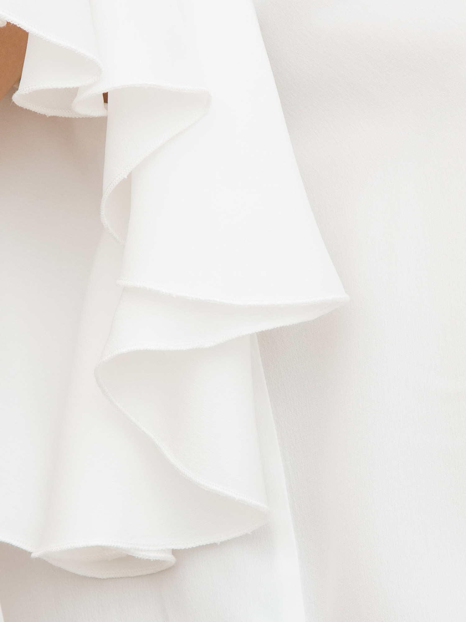 Blusa in crêpe de chine di misto seta dalla linea ampia. scollo a barchetta, maniche con balze a ruches arricciate e logo sul retro. La modella è alta 1.72 e indossa la taglia 40.