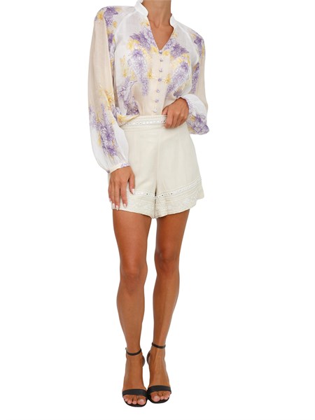 Camicia body in georgette a maniche lunghe con polsi alti e nastro logato sul cannoncino. È caratterizzata da profonda scollatura che genera un'arricciatura al punto vita.