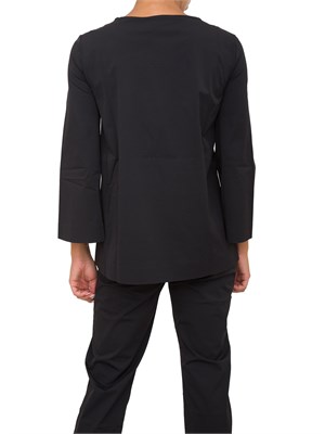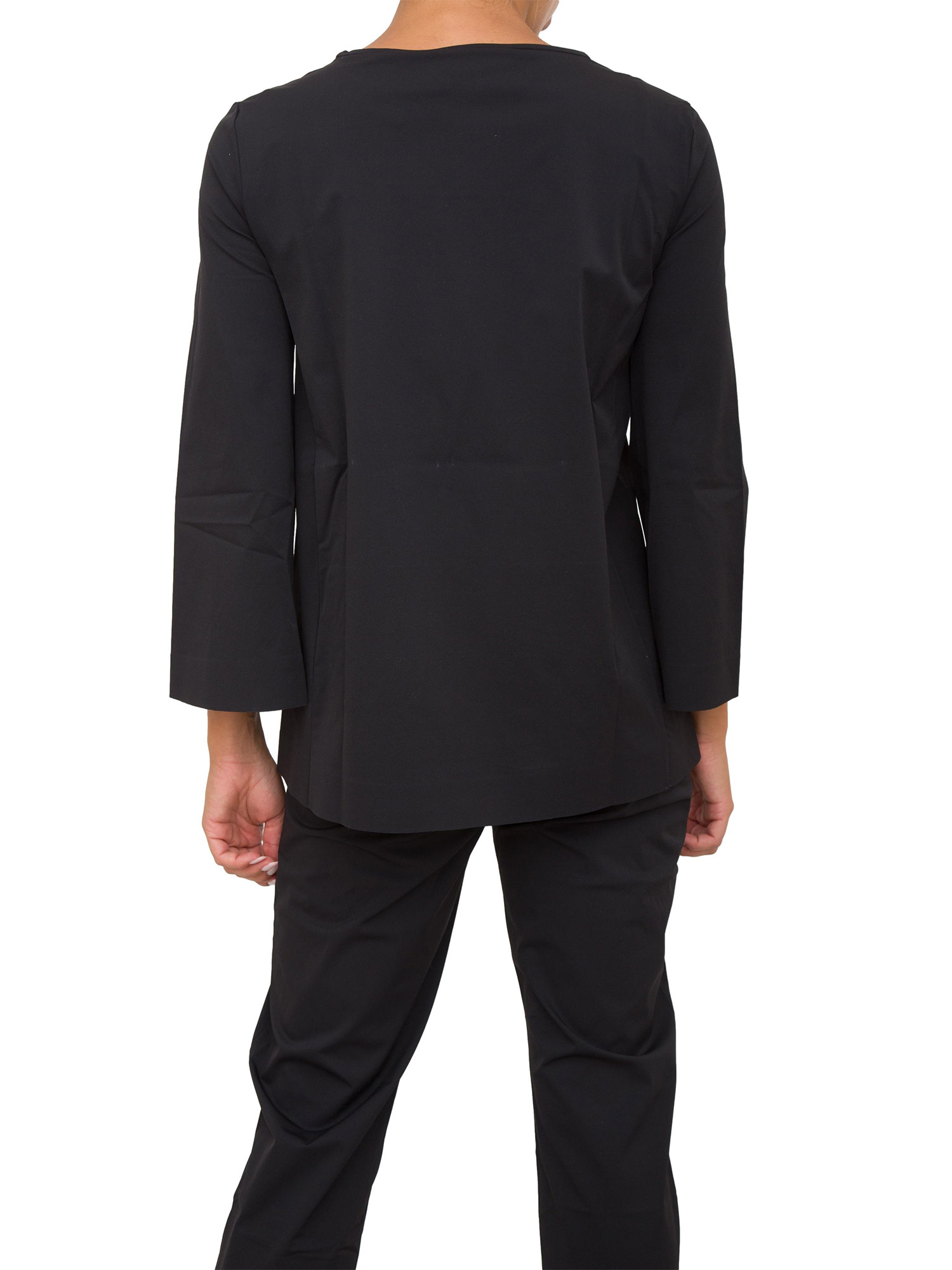 Blusa A-line realizzata in morbido e piacevole jersey tecnico indemagliabile. Il modello è caratterizzato da scollo a barchetta e maniche 3/4 a giro basso leggermente svasate al fondo. Rifinita con bordi a taglio laser e dettagli termonastrati.