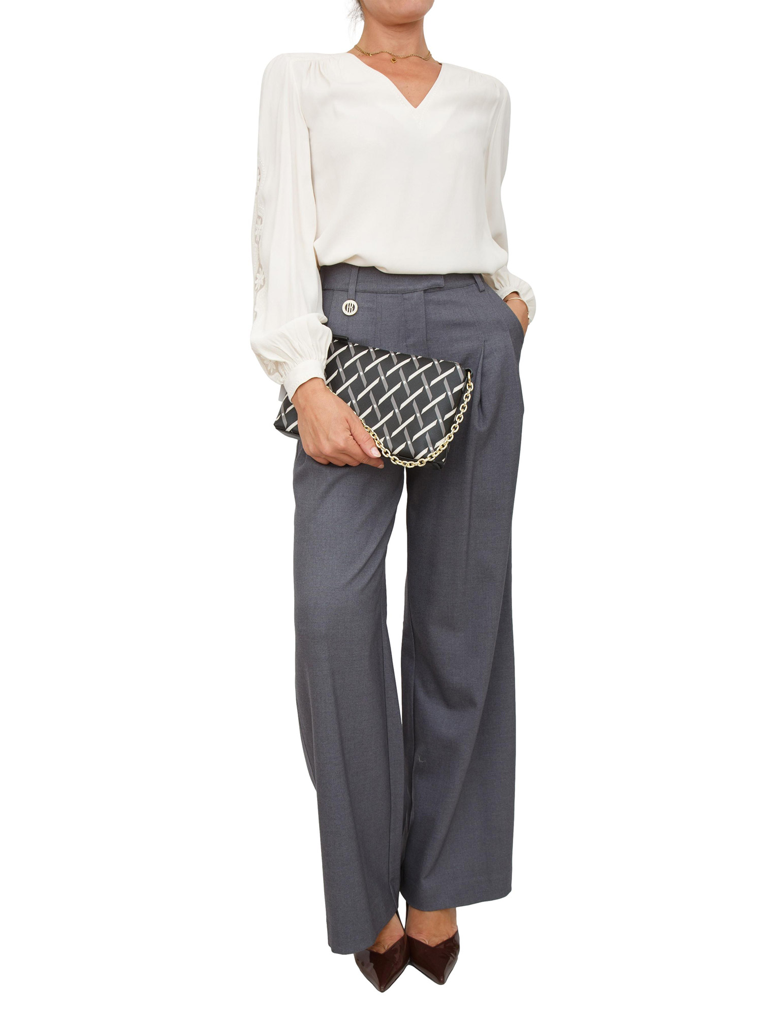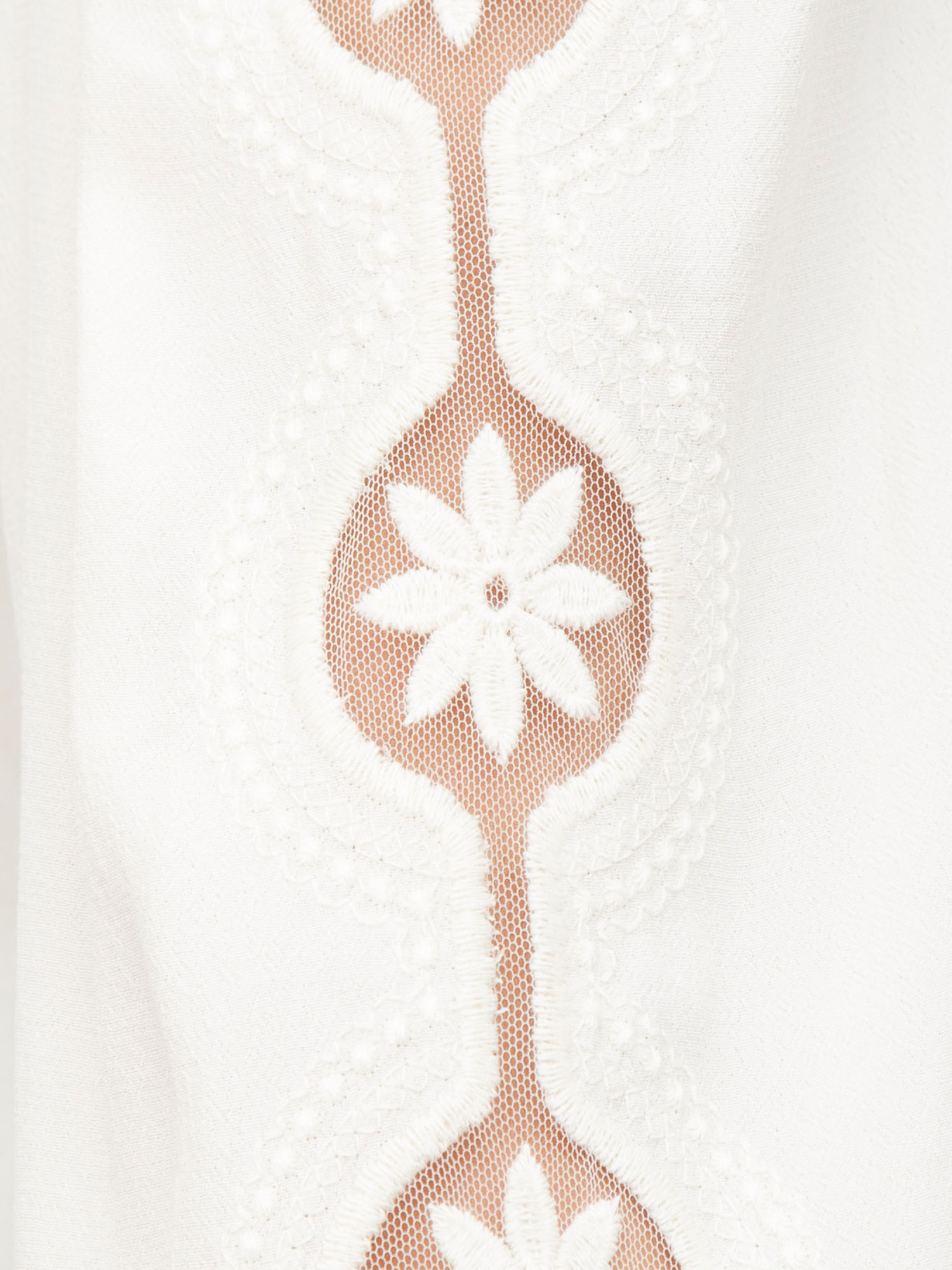 Blusa Twinset realizzata in crêpe leggero di viscosa con ricamo geometrico su scollo e carré. Ha scollatura a V, spalle con arricciatura, maniche lunghe con ricamo floreale traforato, linea morbida. La modella è alta 1.77 e indossa la taglia 38.