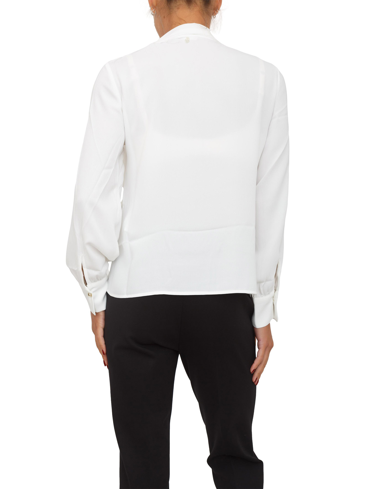 Blusa elegante Liu Jo donna realizzata in crêpe con vestibilità morbida. Design con taglio accollato con foulard, da annodare a fiocco per un effetto romantico, e bottoni logati su spalle e polsi. La modella è alta 1.72 e indossa la taglia 40.
