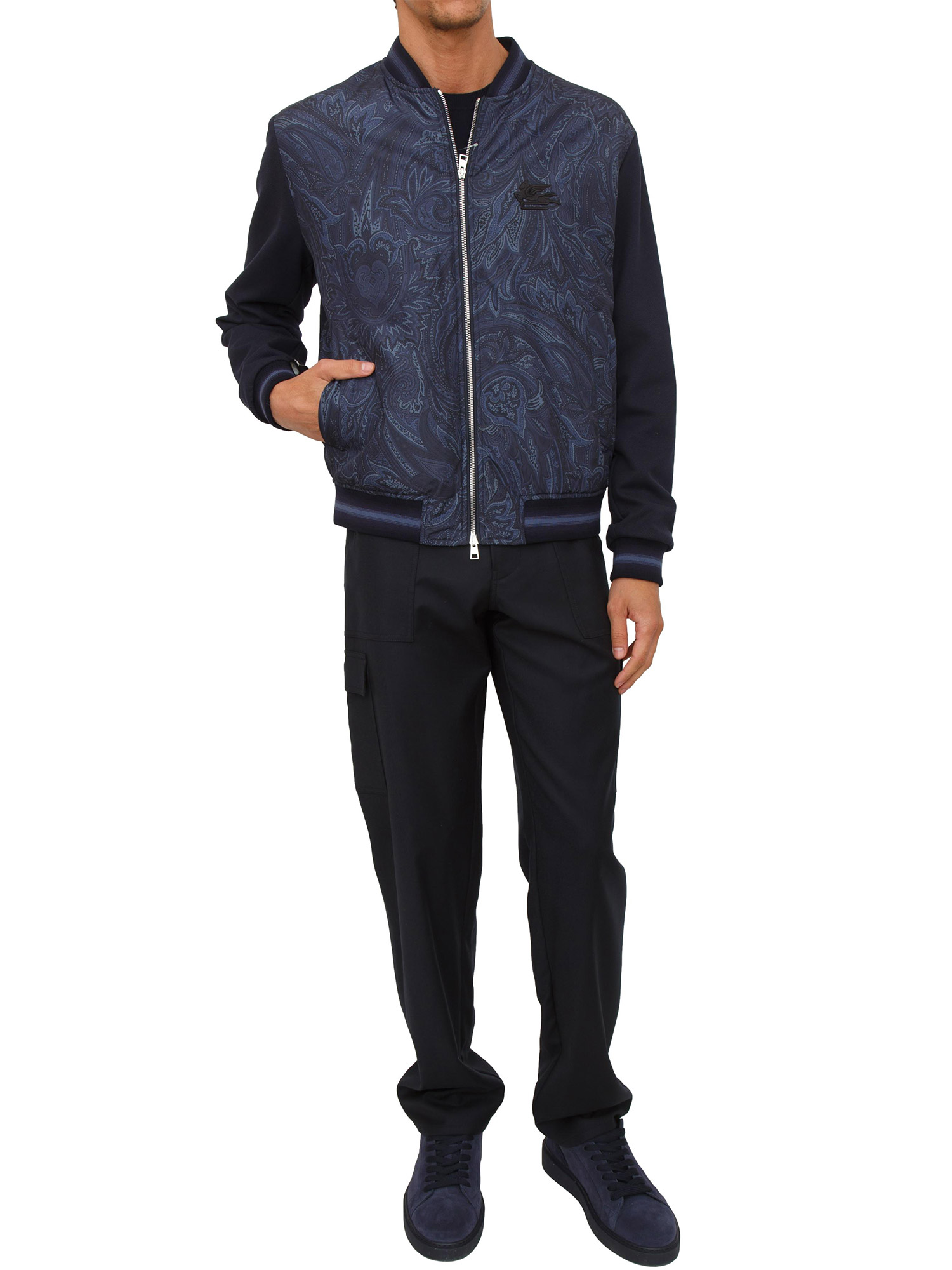 Bomber Etro uomo realizzato in tessuto tecnico con un motivo Paisley sul davanti, tasche laterali e fit regular. Il modello è impreziosito da logo ricamato sul petto, chiusura zip a doppio cursore e da bordi a costine con motivo a righe. Il modello è alto 1.90m e indossa la taglia L.