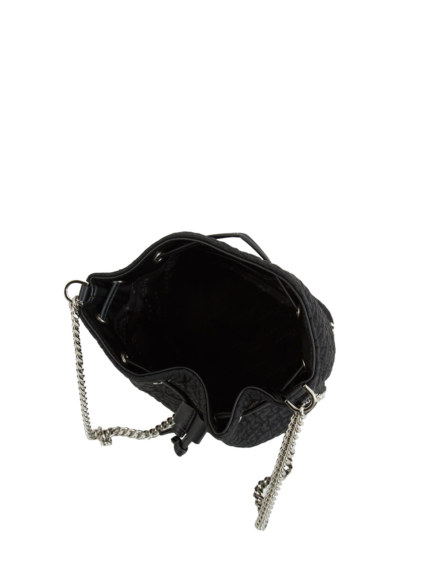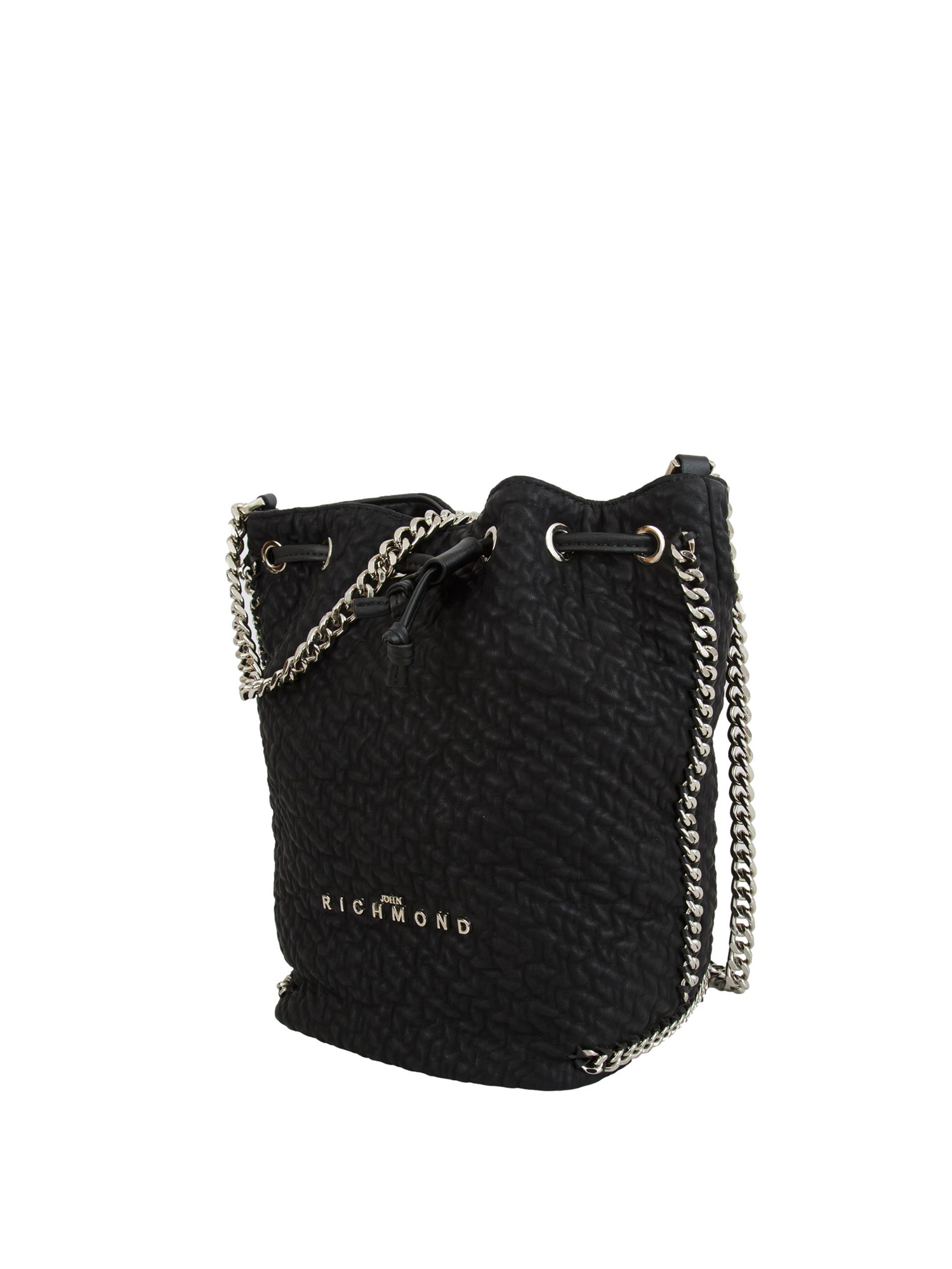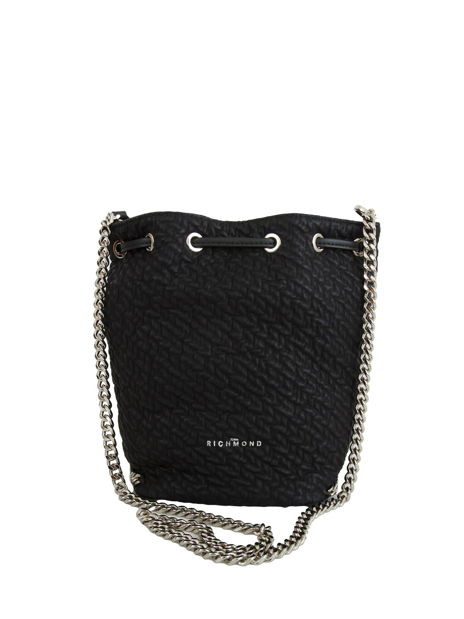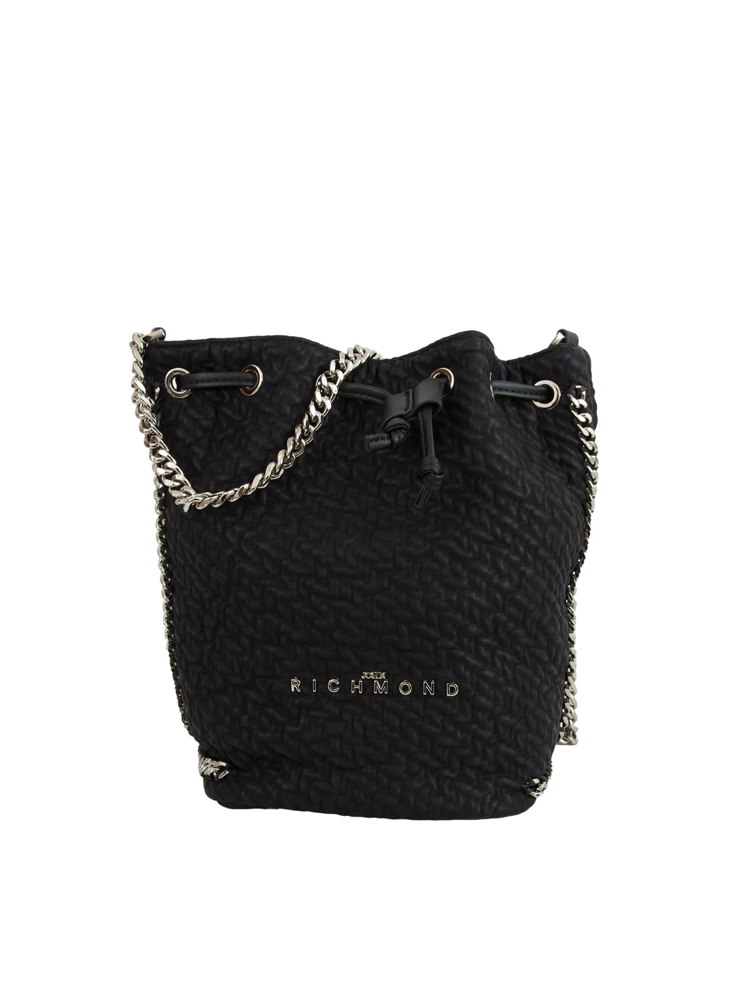 Borsa a secchiello John Richmond in ecopelle con lavorazione intrecciata. Dotata di tracolla a catena argento e chiusura con coulisse. Logo lettering sul davanti e sul dietro ed inserti catena sul fondo laterale. Dimensioni: 20 x 25 x 7