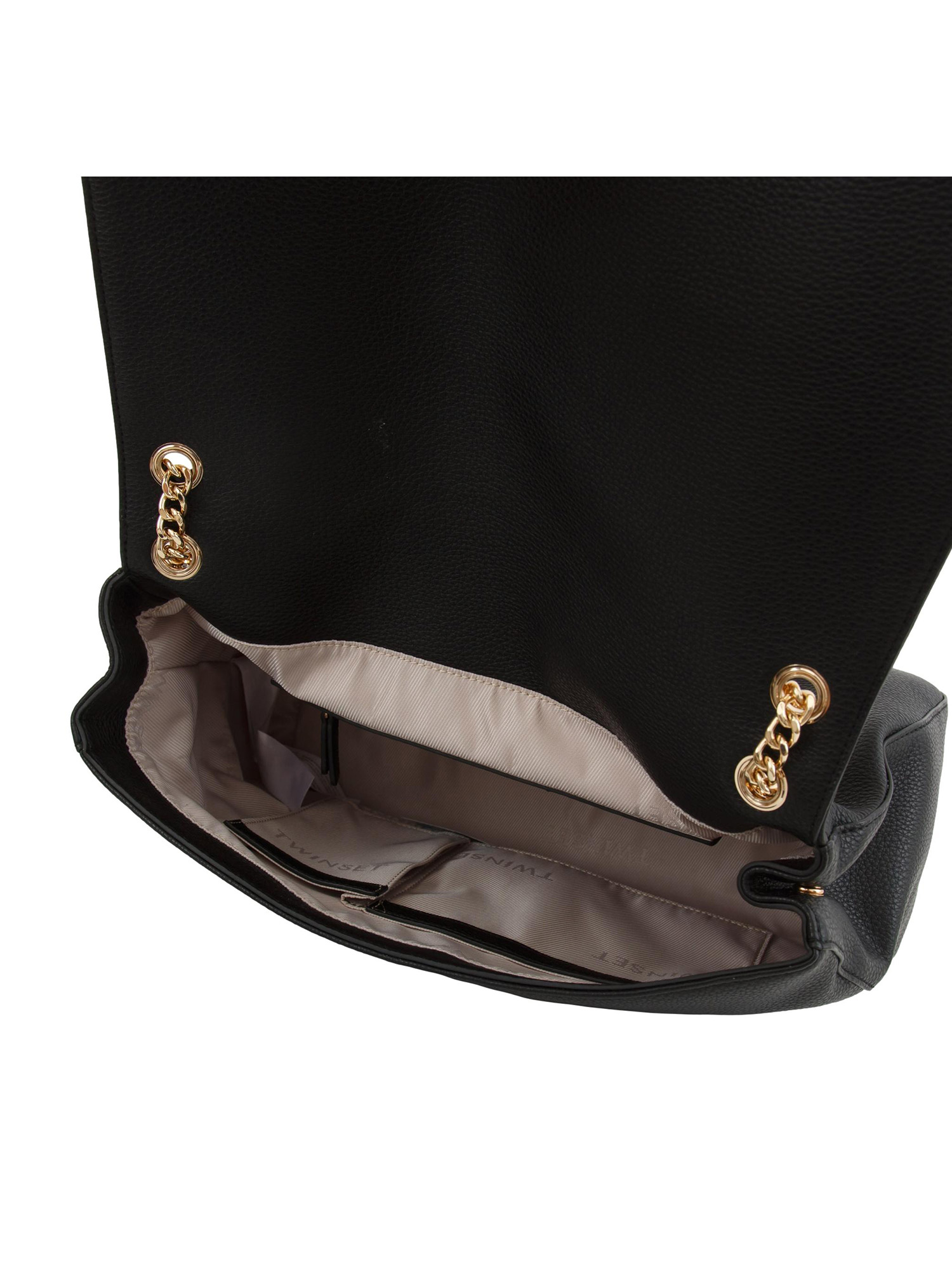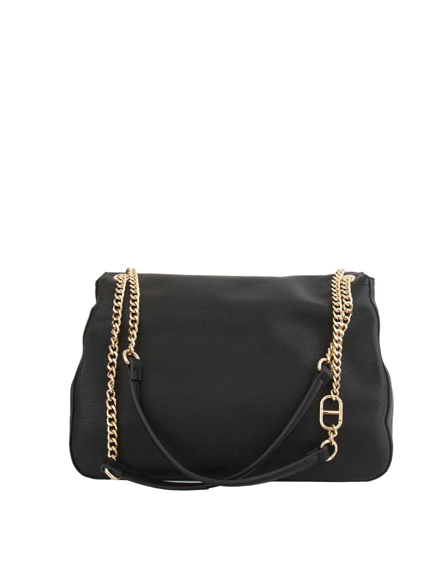 Borsa a spalla 'Brera' Twinset effetto pelle morbida con micrograna e tracolla in catena scorrevole con spallacci, da indossare a spalla e cross-body, inserto logo lettering. Ha la chiusura con patta e magnete, dettagli con profili a cornice imbottita, logo lettering in metallo, foderata. Dimensioni: 35x26x16 cm.