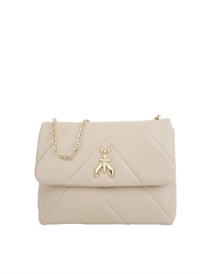 Interpretazione moderna della borsa a tracolla, con linee geometriche e pelle di capretto imbottita e percorsa da trapuntature diagonali. La tracollina in catena metallica è completata da inserto in pelle per un take sofisticato.