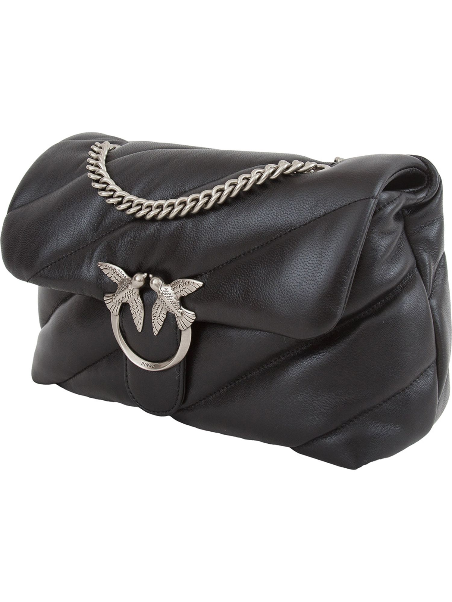 Borsa Pinko Classic Love Bag Puff in morbida nappa con maxi trapuntatura obliqua. La chiusura è completata dall'iconica fibbia in metallo Love Birds Diamond Cut. L'interno è foderato in microfibra scamosciata e comprende tramezza chiusa con zip e tasca a parete. La tracolla combina la classica catena metallica rotonda al pratico spallaccio in nappa. Altezza: 19 cm Larghezza: 11 cm Lunghezza: 27 cm