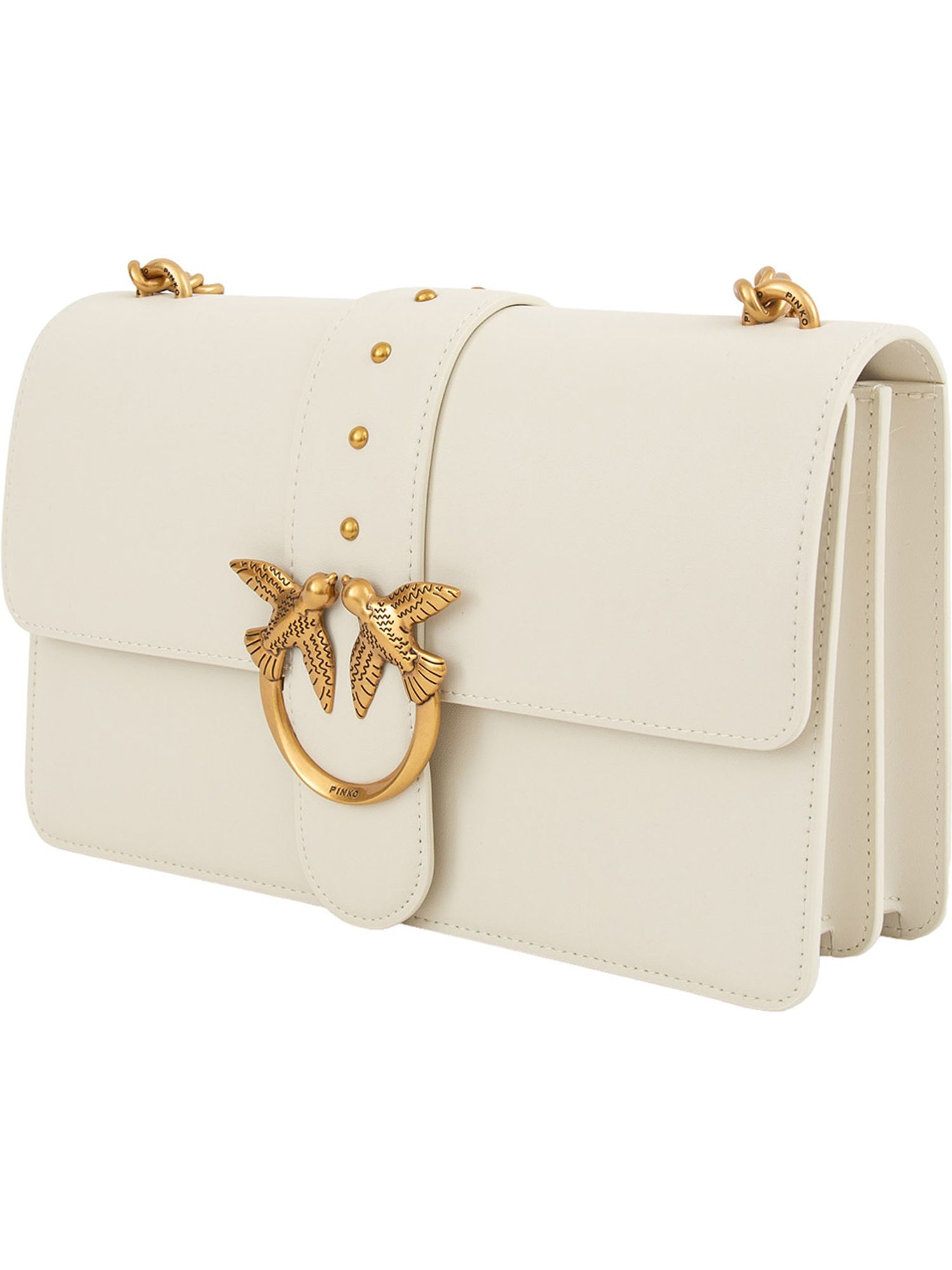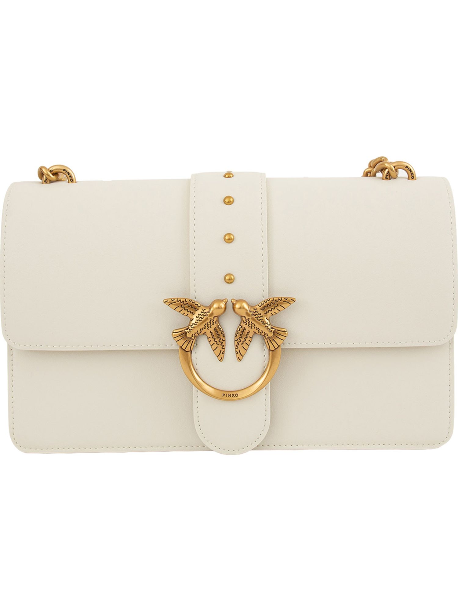 Borsa Pinko Classic Love Bag Icon in morbida pelle mano seta. La chiusura con baccello in pelle e borchie è completata dall'iconica fibbia in metallo Love Birds Diamond Cut in metallo. L'interno è foderato in microfibra scamosciata e comprende tramezza chiusa con zip e tasca a parete. La tracolla rimovibile combina la classica catena rotonda al pratico spallaccio in pelle regolabile.