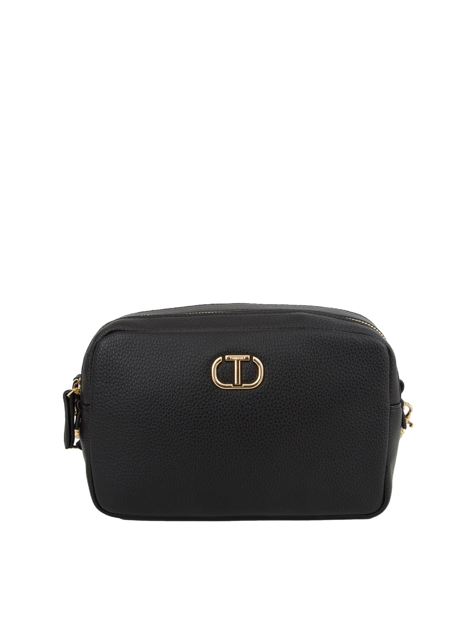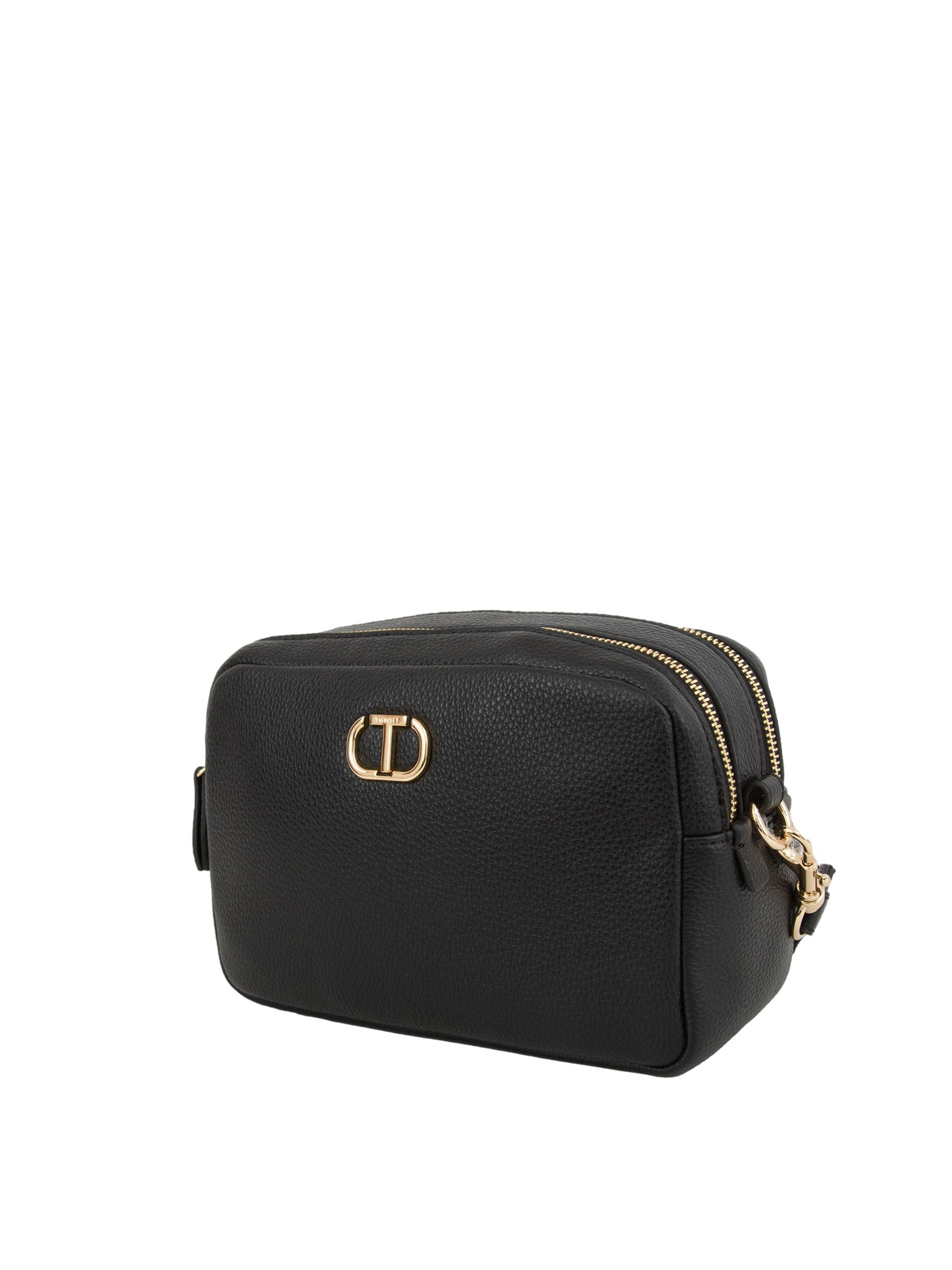 Borsa modello camera bag effetto pelle con grana a stampa cervo morbida, tracolla in nastro regolabile e rimovibile personalizzata con logo lettering in tinta stampato a caldo. Portamonete a cilindro con zip applicato alla tracolla rimovibile con moschettone, costruzione a doppio comparto con zip, logo Oval T in metallo, foderata.