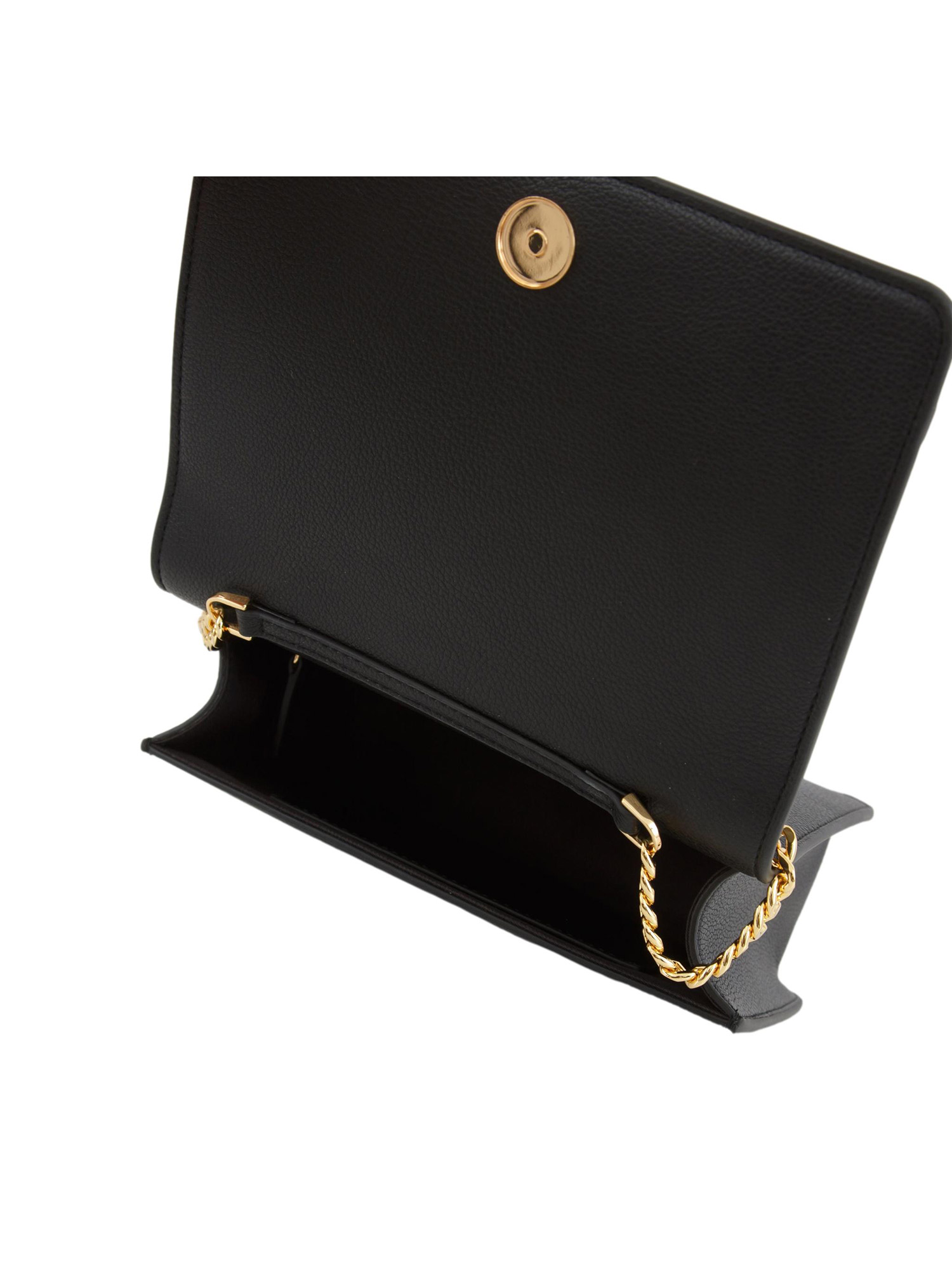 Borsa realizzata in materiale sintetico con texture effetto pelle. Con tracolla in catena groumette, ha shape compatta e lineare ed è impreziosita dalla placca con logo sul davanti.