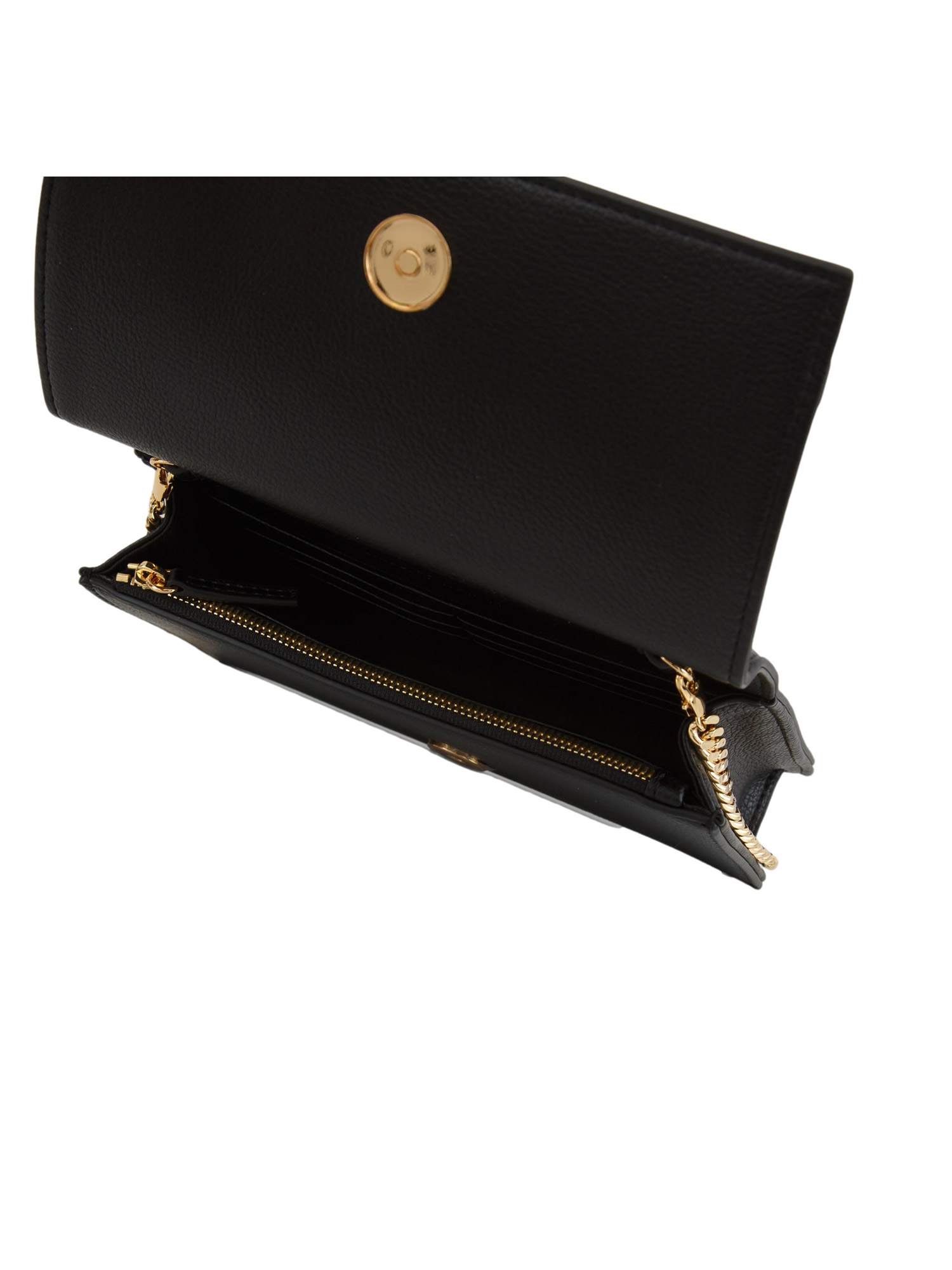 Borsa realizzata in materiale sintetico con texture effetto pelle. Dalla shape compatta e lineare, ha tracolla in catena groumette con spallaccio ed è impreziosita dalla placca con logo sul davanti.