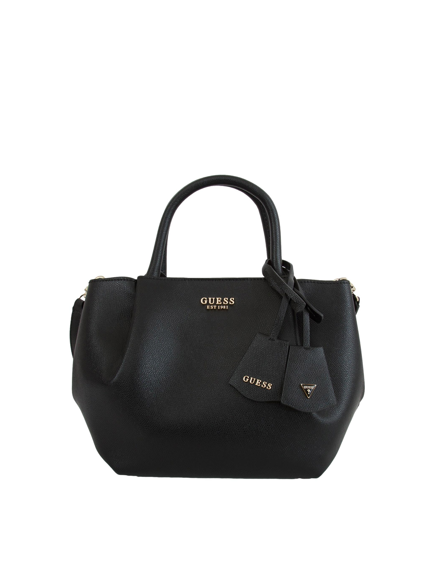 Borsa Amorette Guess Jeans realizzata in ecopelle con chiusura bottone automatico. Dotata di doppio charm logato removibile e pochette interna con cerniera. Dimensioni: 40x37x10 cm.