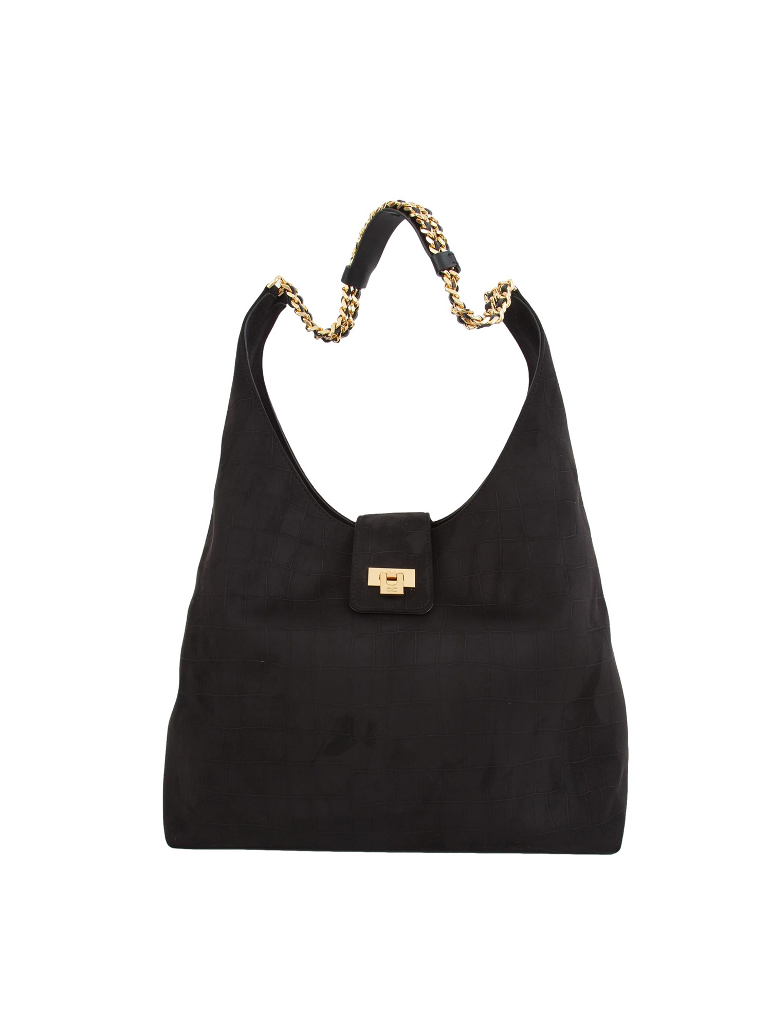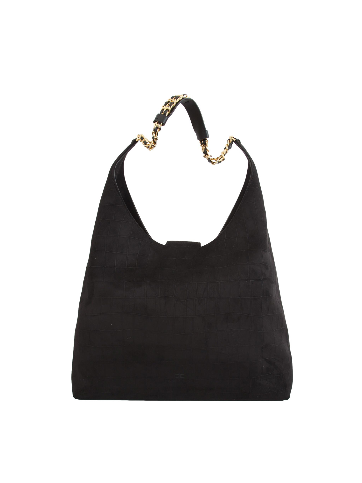 Borsa hobo Elisabetta Franchi realizzata in suede con texture a stampa cocco. Ha manici impreziositi dalle catene intrecciate in metallo dorato. La chiusura è illuminata dalla placca con logo. Dimensioni 34 x 52 x 13 cm.