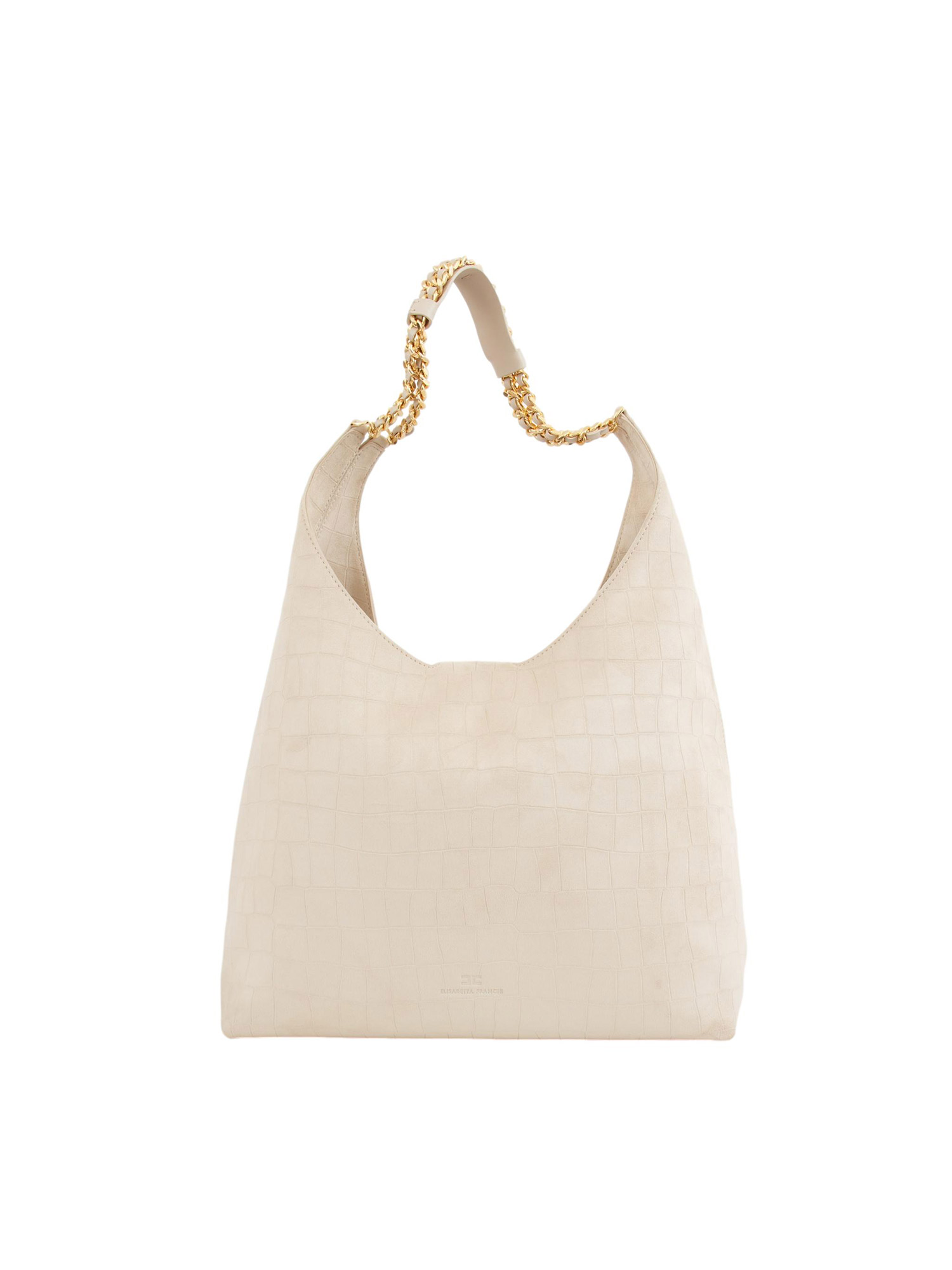 Borsa hobo Elisabetta Franchi realizzata in suede con texture a stampa cocco. Ha manici impreziositi dalle catene intrecciate in metallo dorato. La chiusura è illuminata dalla placca con logo. Dimensioni 34 x 52 x 13 cm.