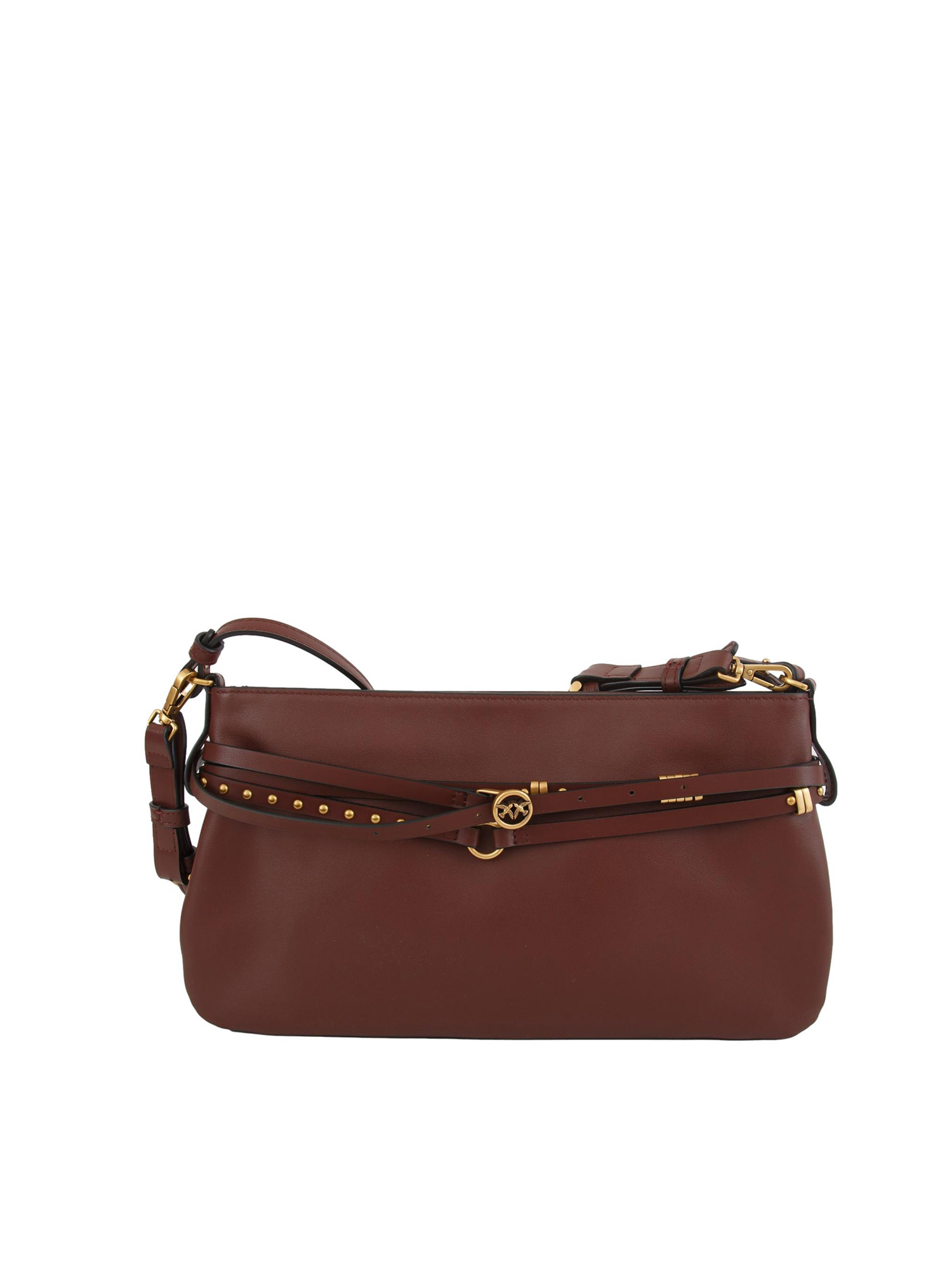 Borsa media Belt Bag Pinko con design piatto e forma leggermente a trapezio, realizzata in morbida pelle. Decorata da una sottile cintura coordinata regolabile che avvolge la parte superiore con più giri, arricchita da borchie arrotondate, una piccola fibbia Love Birds e anelli decorativi. Dimensioni: 33x20x8 cm.