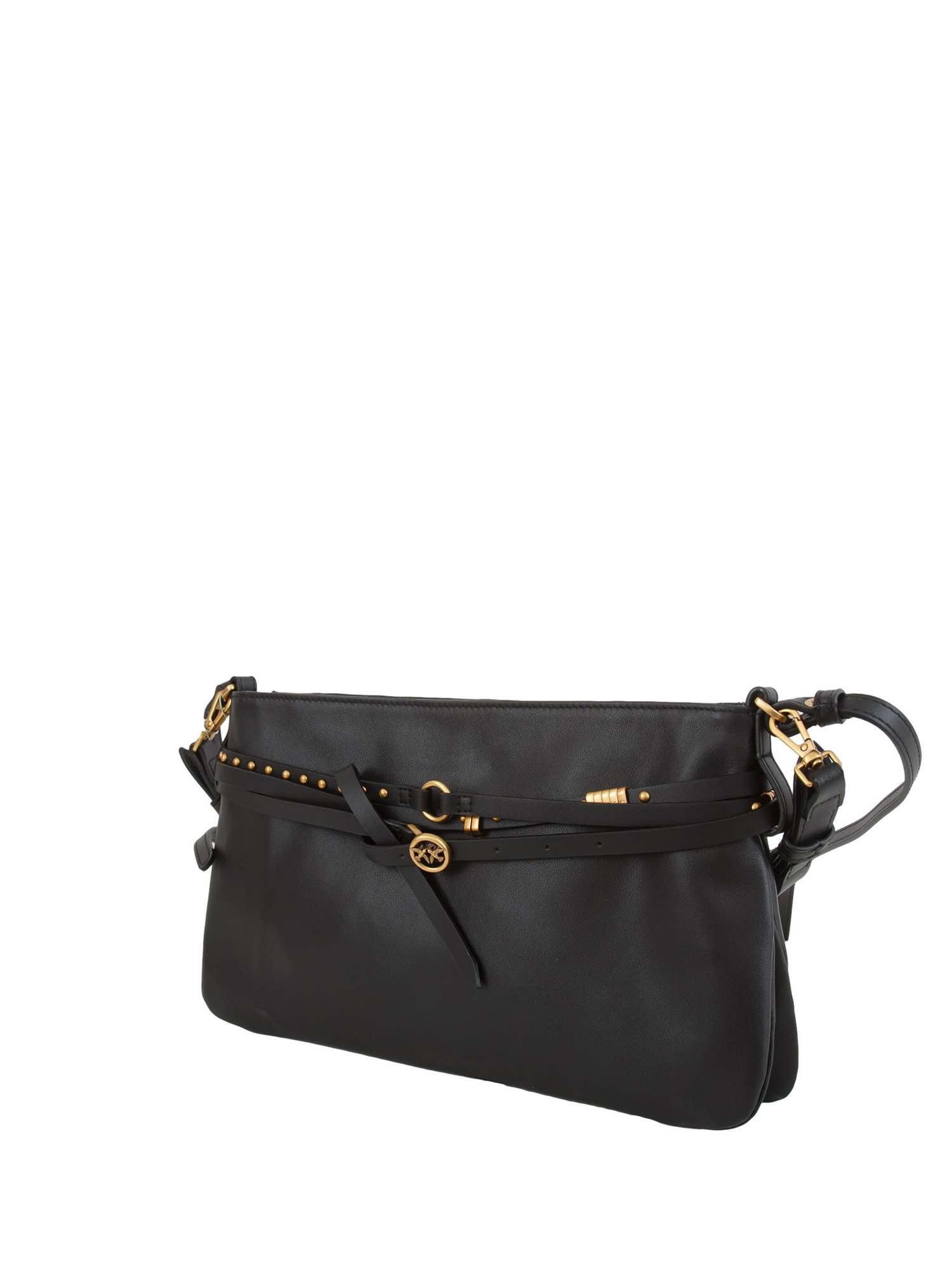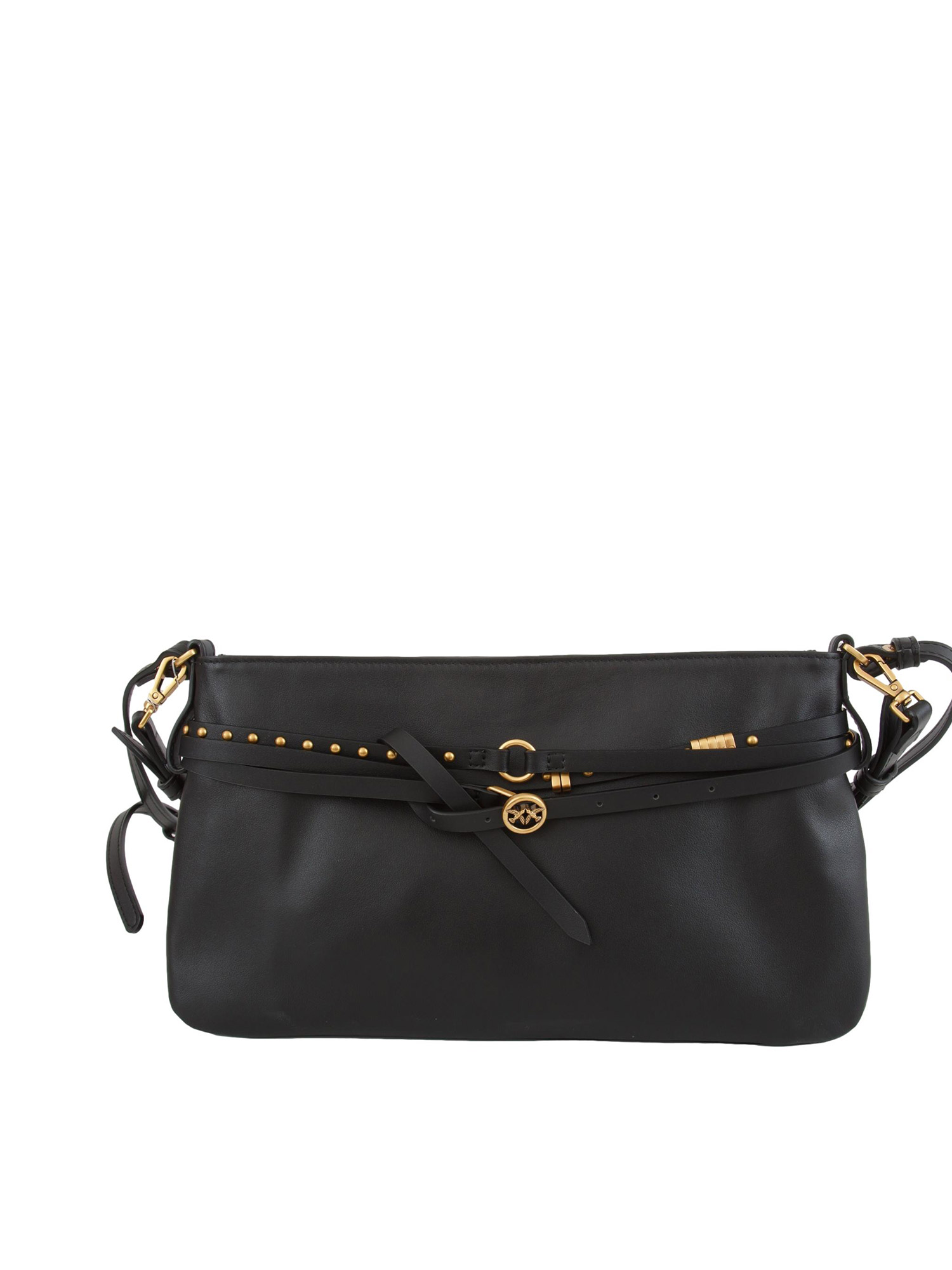 Borsa media Belt Bag Pinko con design piatto e forma leggermente a trapezio, realizzata in morbida pelle. Decorata da una sottile cintura coordinata regolabile che avvolge la parte superiore con più giri, arricchita da borchie arrotondate, una piccola fibbia Love Birds e anelli decorativi. Dimensioni: 33x20x8 cm.