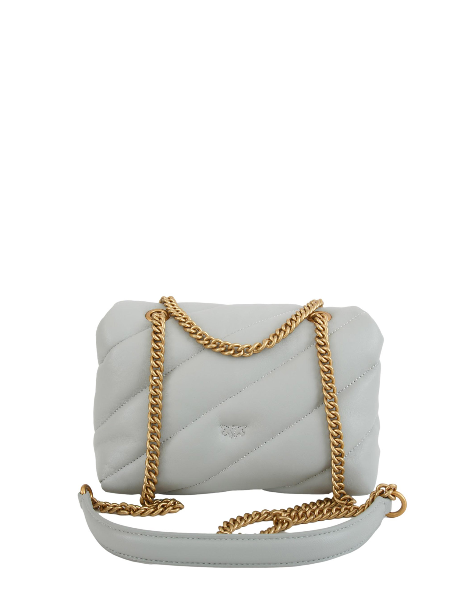 Mini Love Bag Puff Pinko in morbida nappa con maxi trapuntatura obliqua. Chiusura con iconica fibbia Love Birds Diamond Cut, interno foderato, tramezza chiusa con zip e tasca a parete. La tracolla combina la classica catena metallica rotonda al pratico spallaccio in nappa. Dimensioni: 21 x 15 x 9 cm.