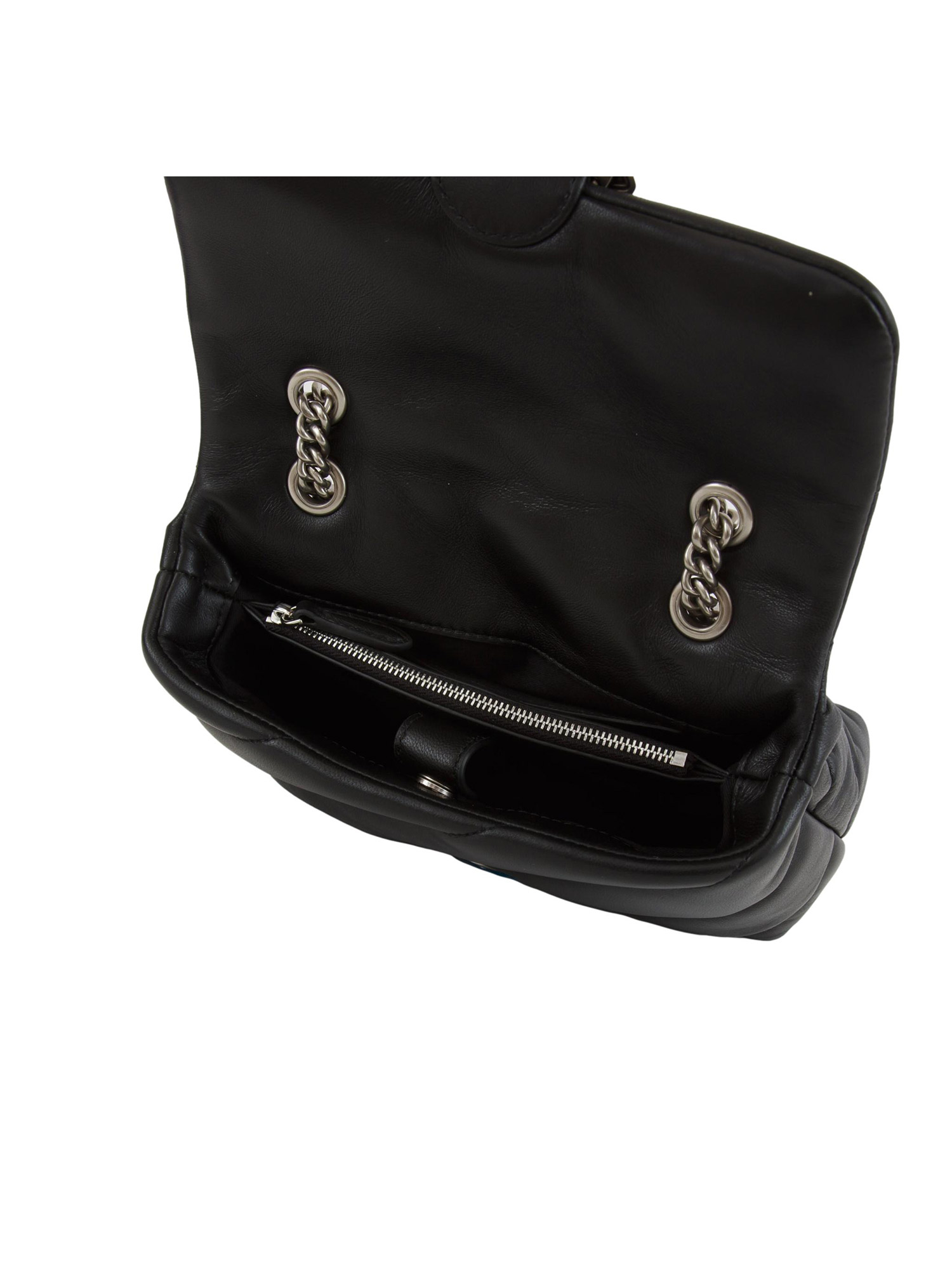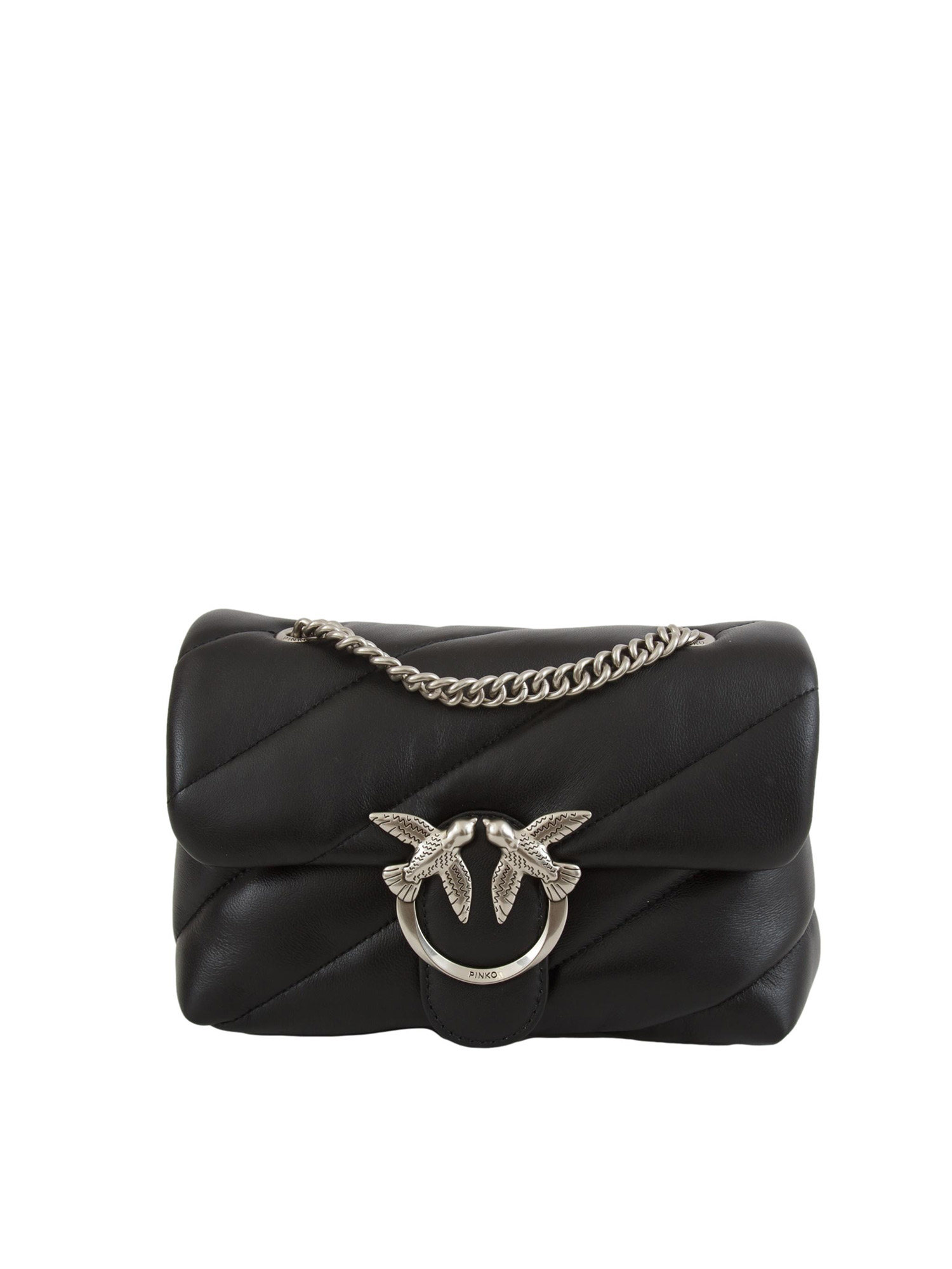 Mini Love Bag Puff Pinko in morbida nappa con maxi trapuntatura obliqua. Chiusura con iconica fibbia Love Birds Diamond Cut, interno foderato, tramezza chiusa con zip e tasca a parete. La tracolla combina la classica catena metallica rotonda al pratico spallaccio in nappa. Dimensioni: 21 x 15 x 9 cm.