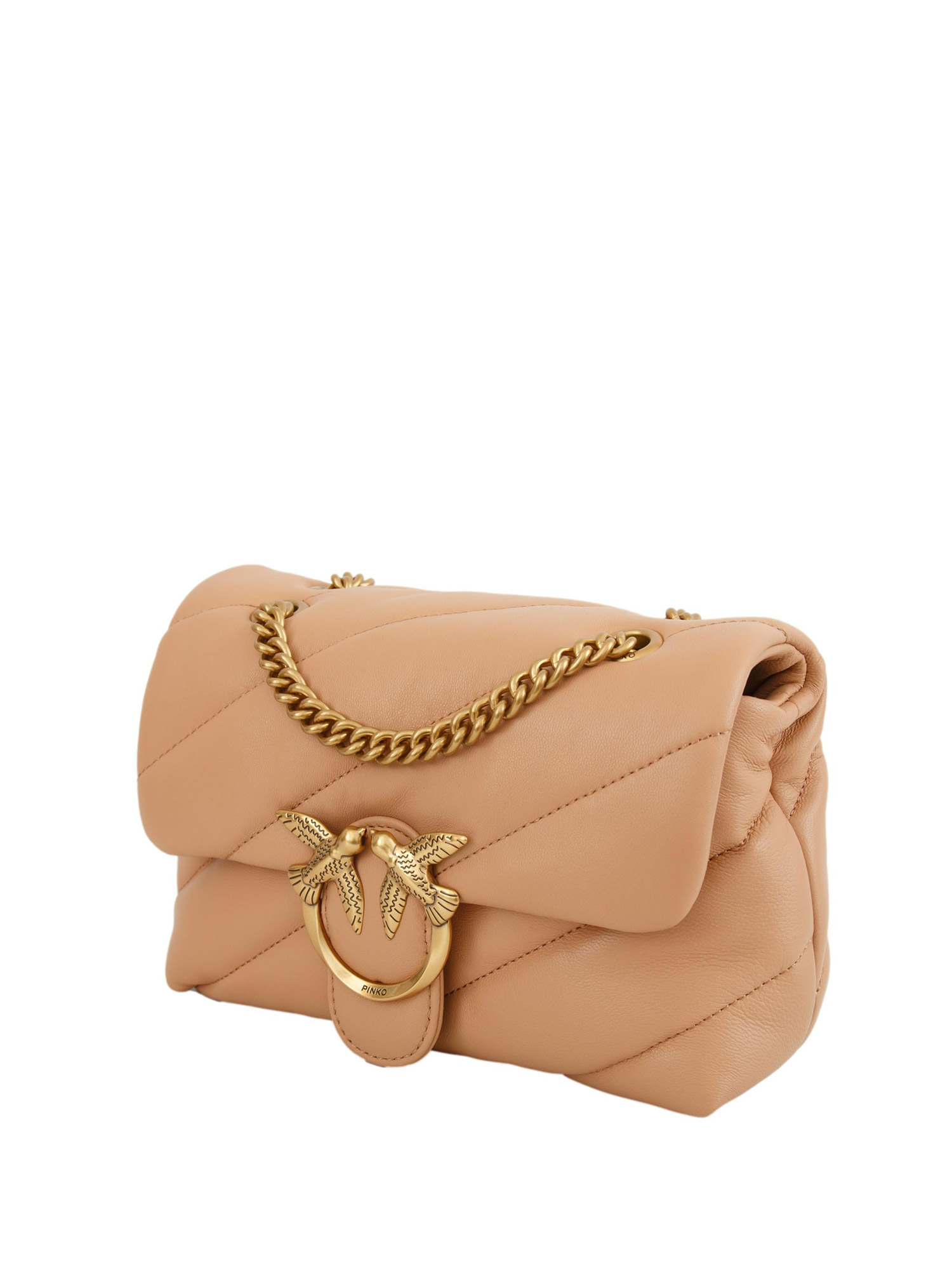 Borsa Mini Love Bag Puff Pinko in morbida nappa con maxi trapuntatura obliqua. Chiusura con fibbia in metallo Love Birds Diamond Cut. Interno foderato in microfibra scamosciata e tramezza con zip e tasca a parete. Tracolla con catena metallica e spallaccio in nappa. Dimensioni: 21x15x9 cm.