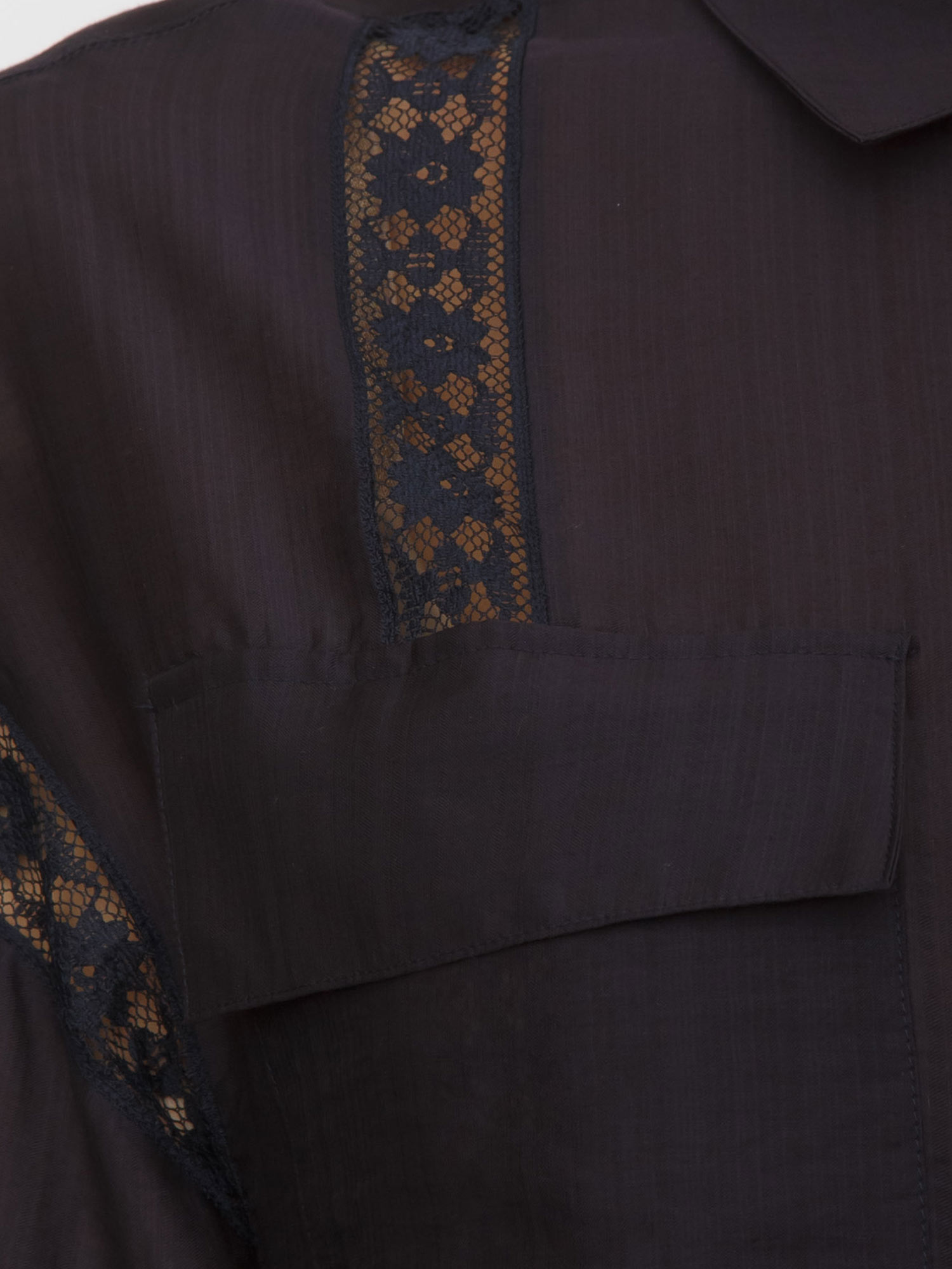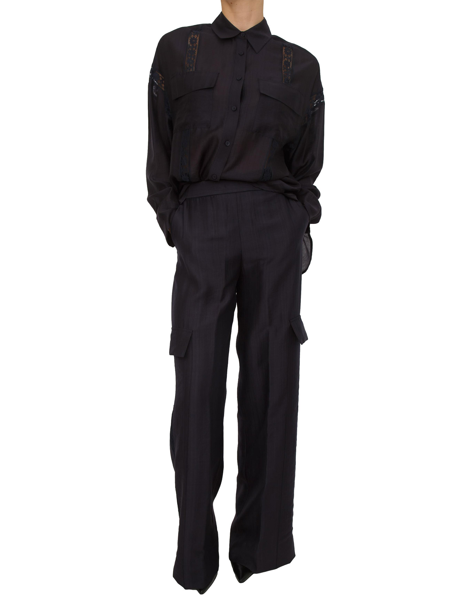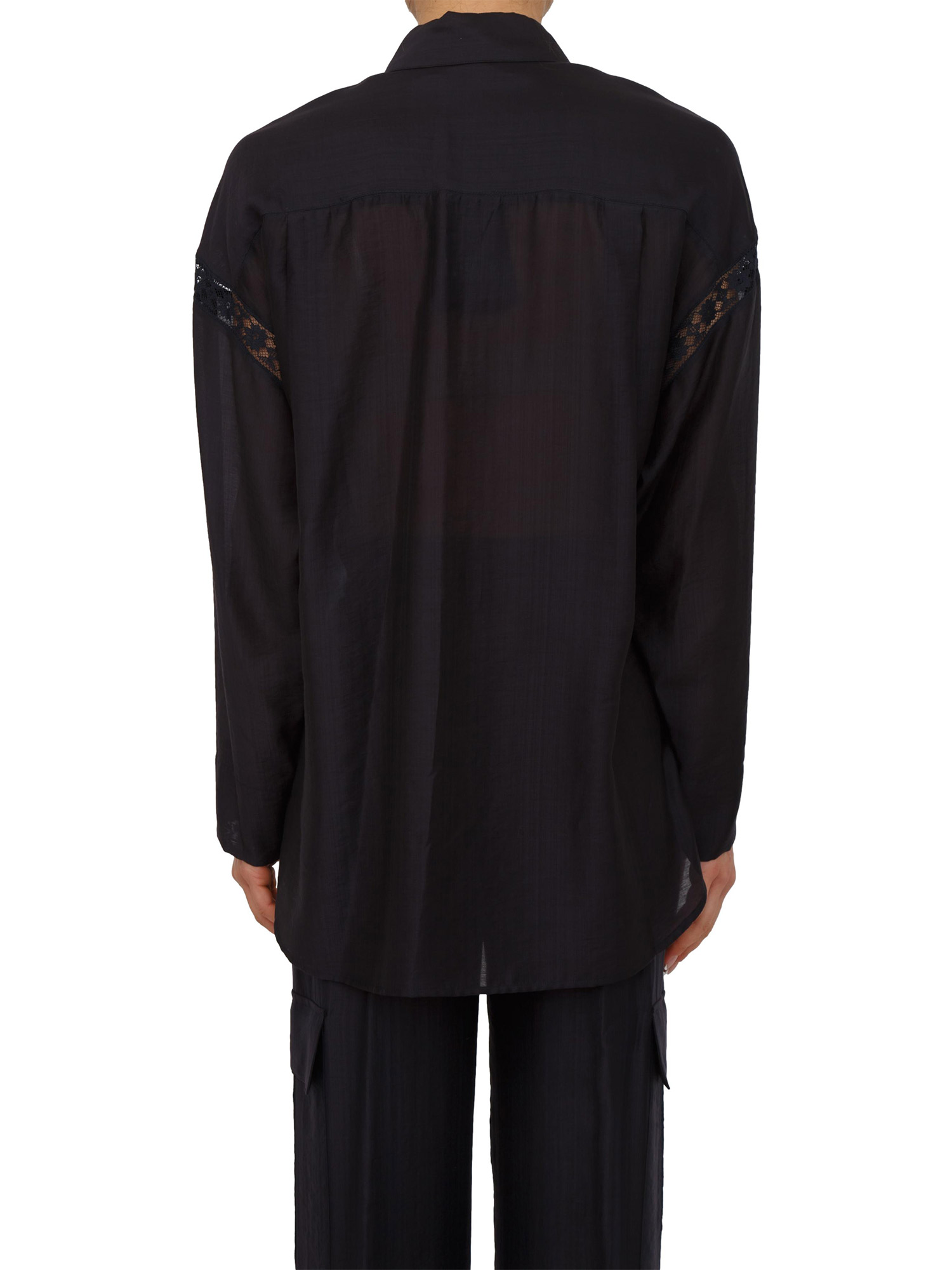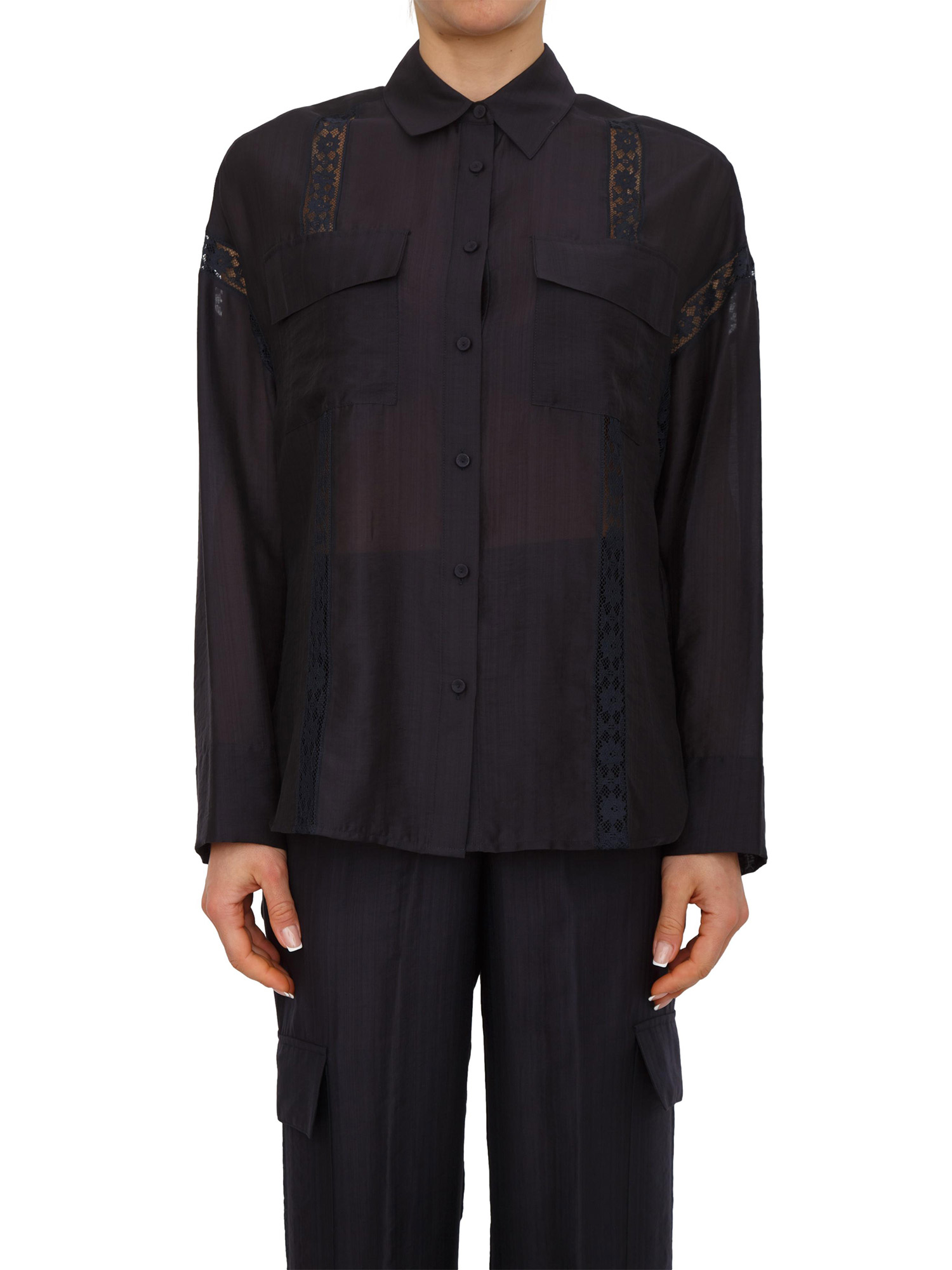 Fluida e leggera, questa camicia Blugirl in lyocell con inserti in pizzo see-through. ha chiusura con bottoni in tono, maniche lunghe con polsino e bottone, spalle scese, tasche applicate con patta, linea morbida. in total look con i pantaloni in coordinato per un'occasione speciale rilassata. La modella è alta 1.72 e indossa la taglia 40.