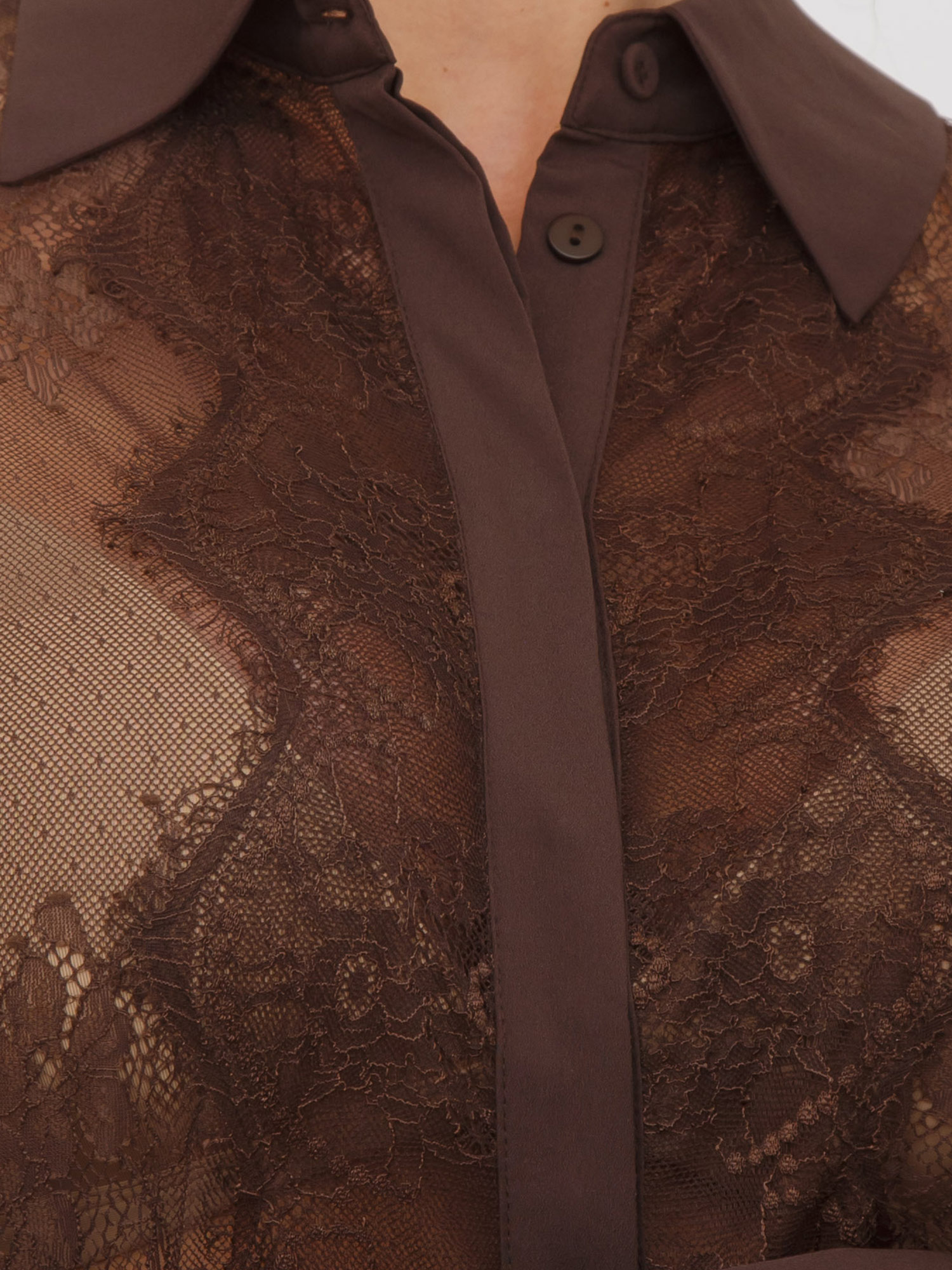 Delicate trasparenze per la camicia in pizzo floreale Blugirl decorata all'apertura da una banda di pizzo smerlato. con dettagli in misto cotone, ha chiusura con bottoni nascosti, polsini, fondo smerlato, linea dritta. un modello stand out che puoi abbinare ai pantaloni in coordinato.