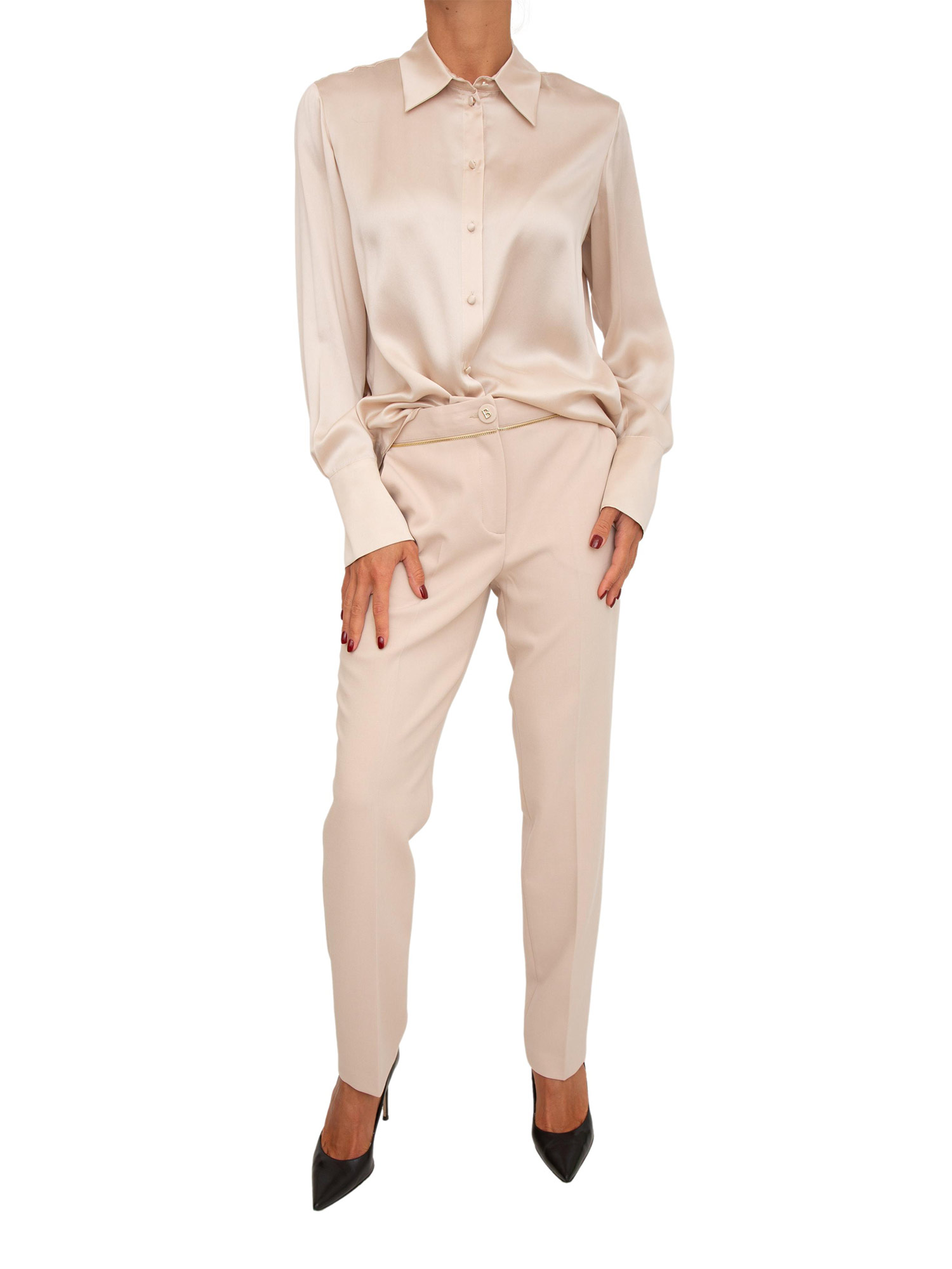 Essential del guardaroba da interpretare in una miriade di look. Camicia Blugirl regular in raso di seta lavata, chiusura con bottoni ricoperti, maniche lunghe con polsi e bottoni che creano spacchetto e taglio carré sul retro. La modella è alta 1.72 e indossa la taglia 40.