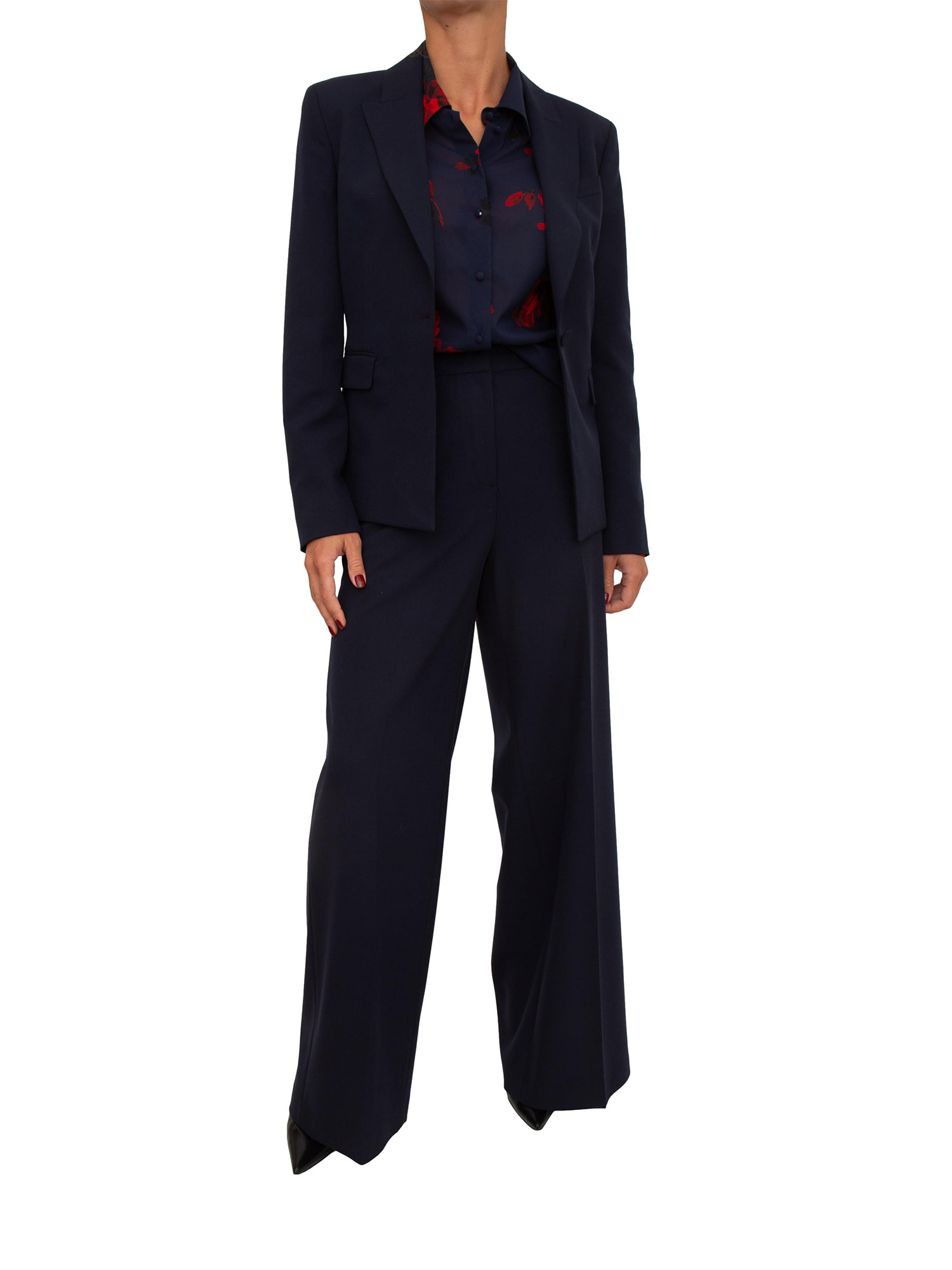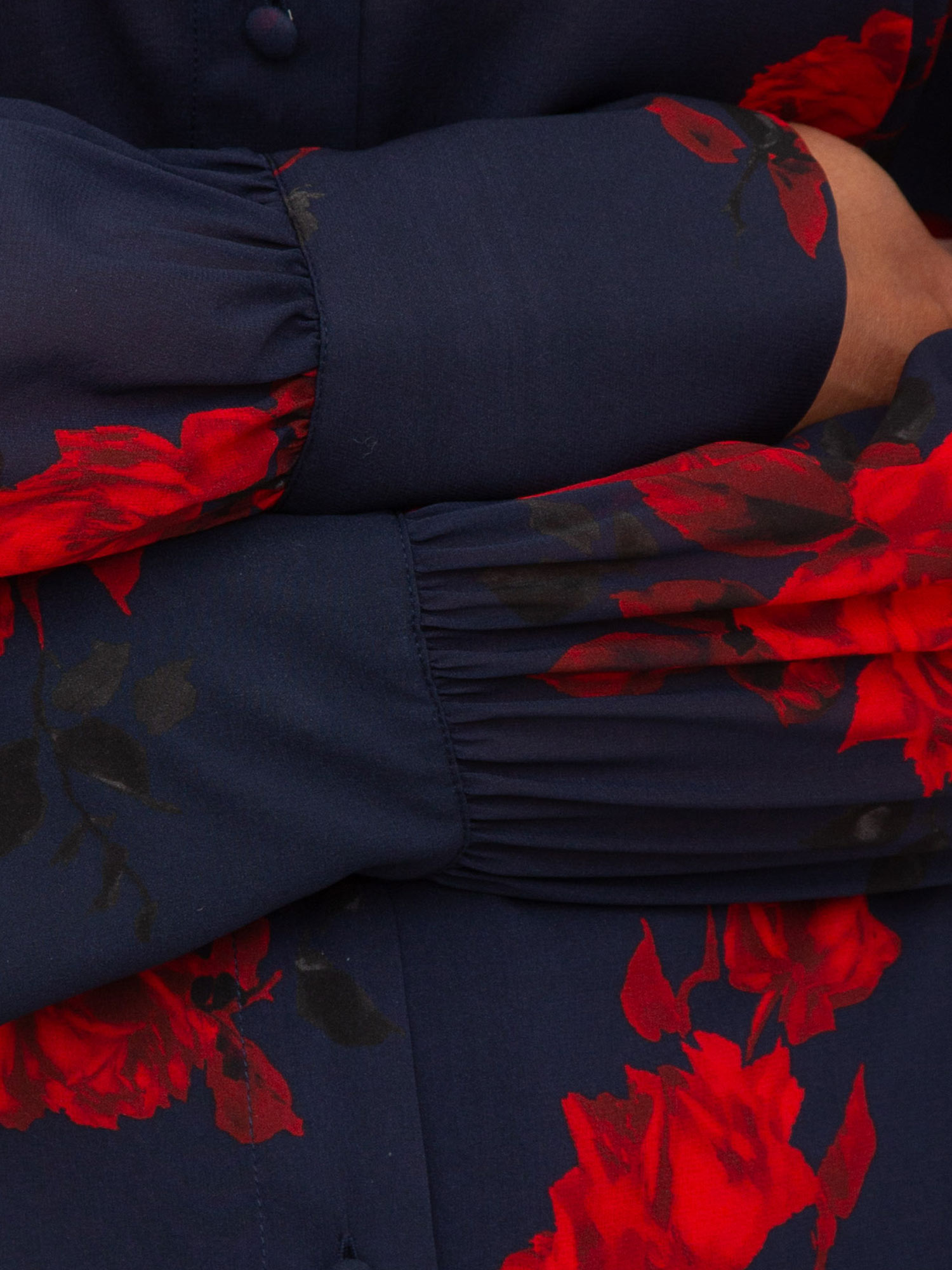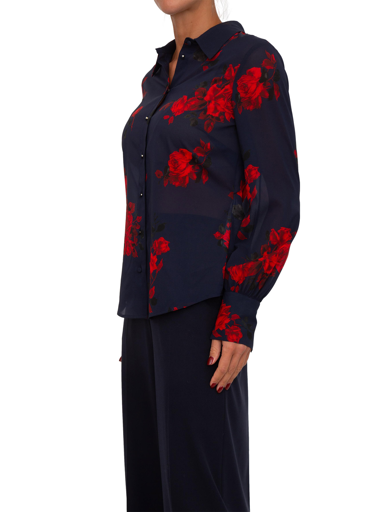 Una delicata stampa floreale all over per la camicia Blugirl in voile di seta. Ha linea regular, chiusura con bottoni ricoperti e maniche lunghe con polsino e bottone. leggera, impalpabile, di carattere. La modella è alta 1.72 e indossa la taglia 40.