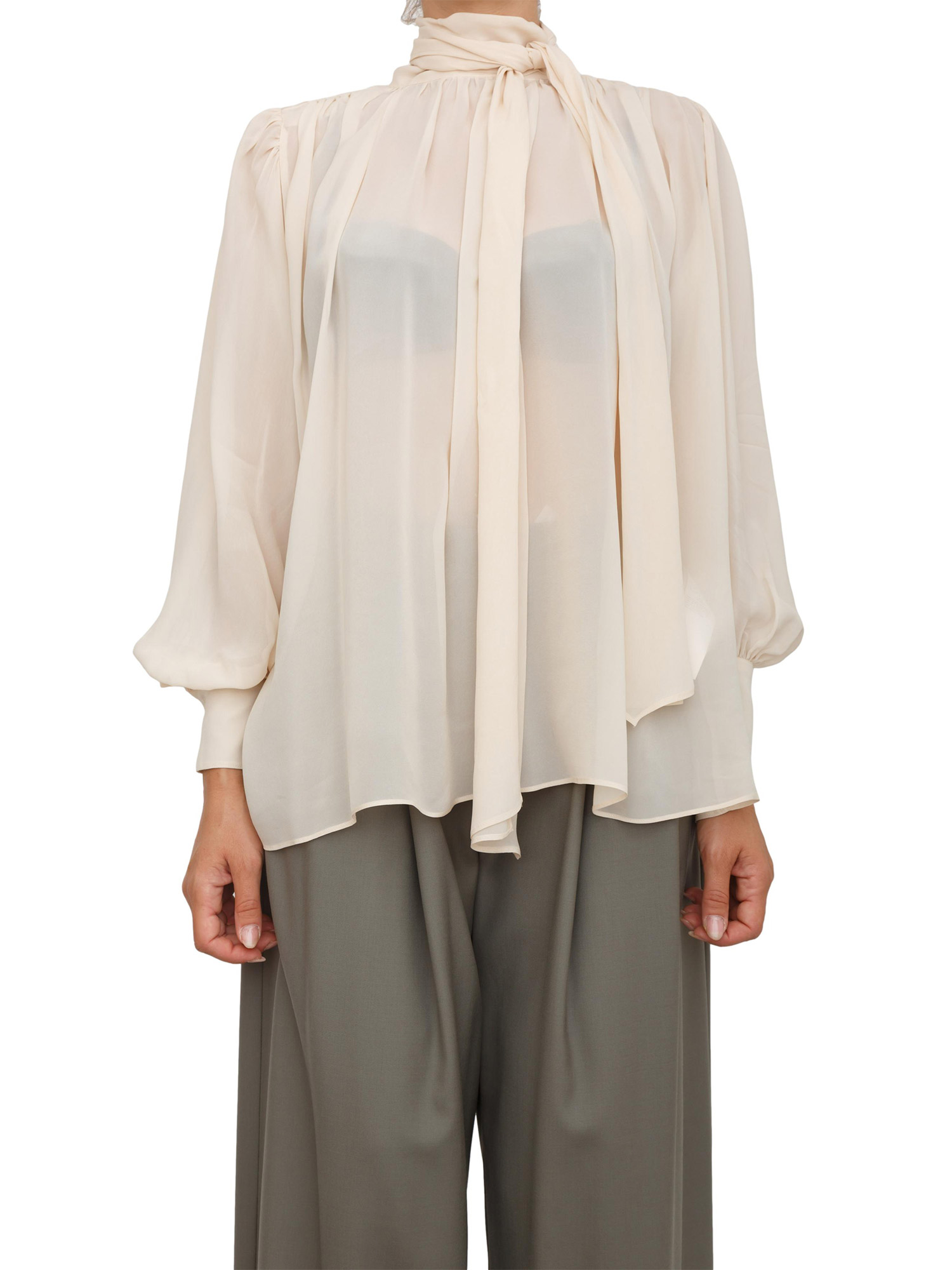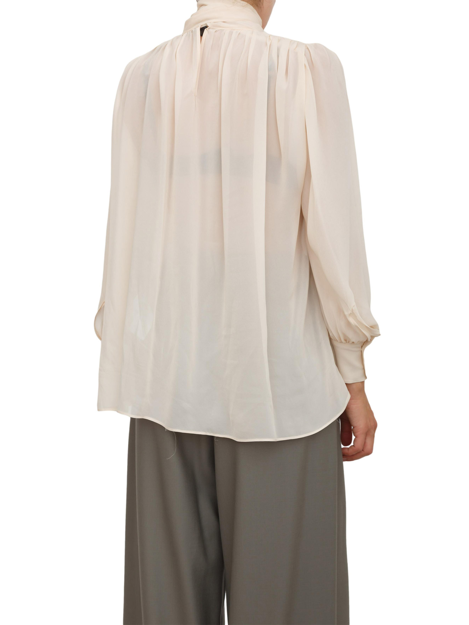 Camicia blusa Marella realizzata in georgette di viscosa con collo alto e chiusura posteriore a goccia e con fiocco. Design arricchito da motivo di arricci su tutto lo scollo e manica lunga a sbuffo sul polso. Stupenda a romantica questa camicia da indossare ad ogni occasione. La modella è alta 1.72 e indossa la taglia 40.