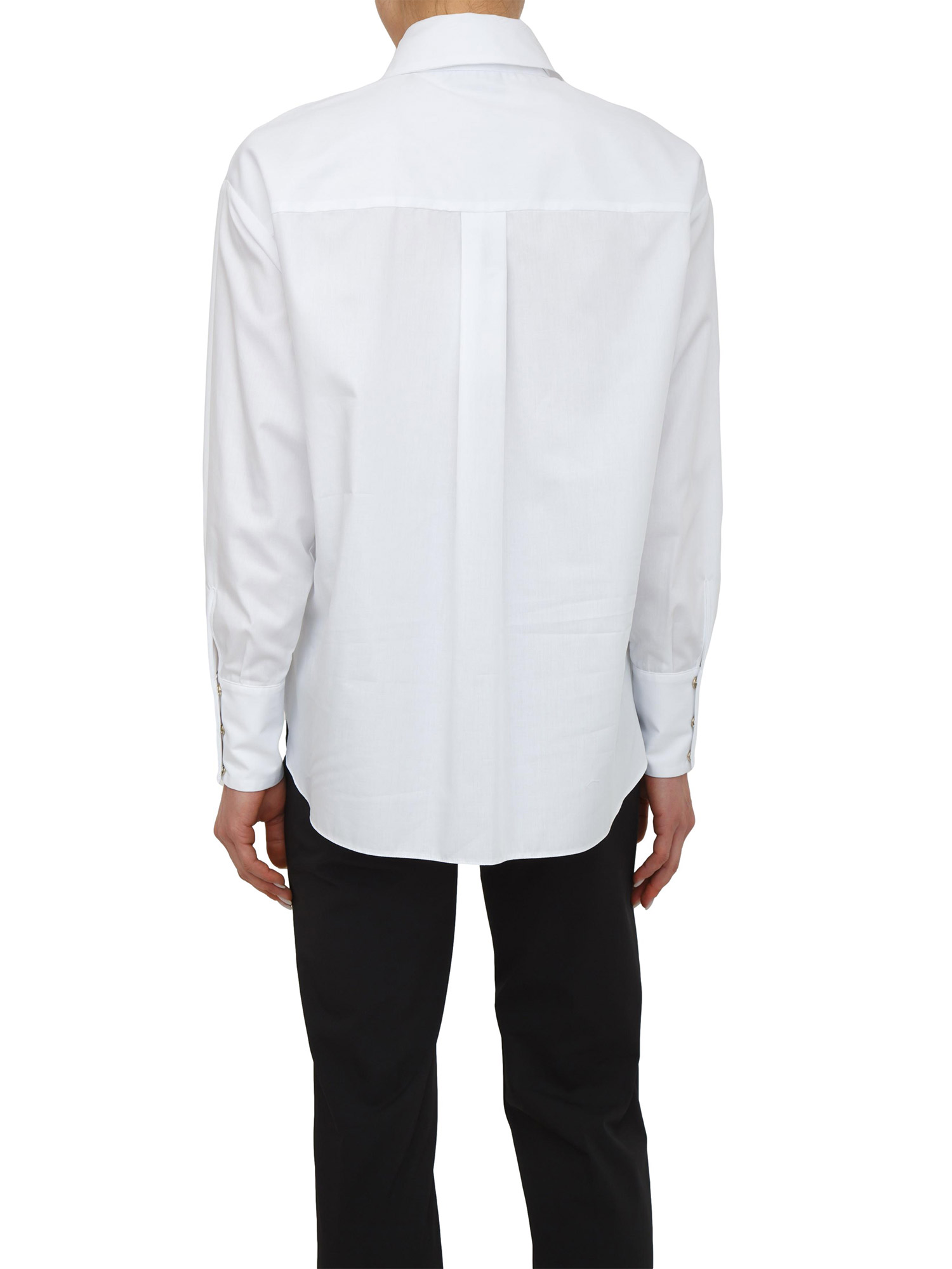Camicia in cotone Elisabetta Franchi dalla vestibilità regular. Ha colletto classico e maniche lunghe. La cravatta in tono completa l'ispirazione maschile del capo. I ricami con logo sui polsi sono l'ultimo dettaglio di stile. La modella è alta 1.72 e indossa la taglia 40.