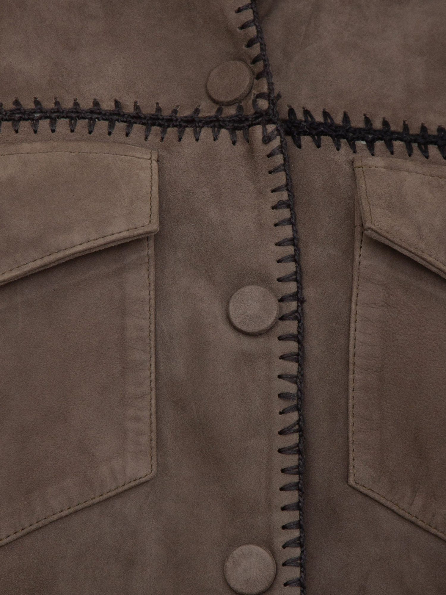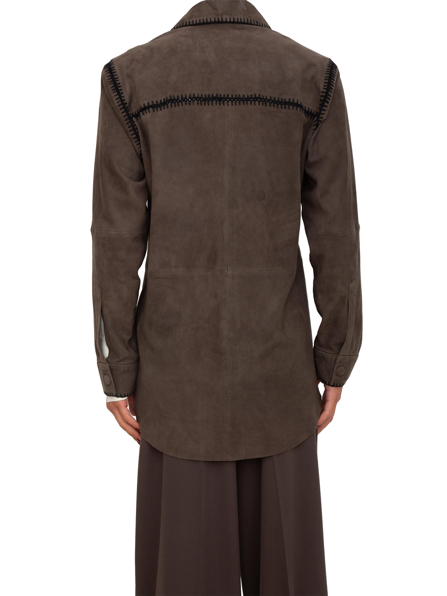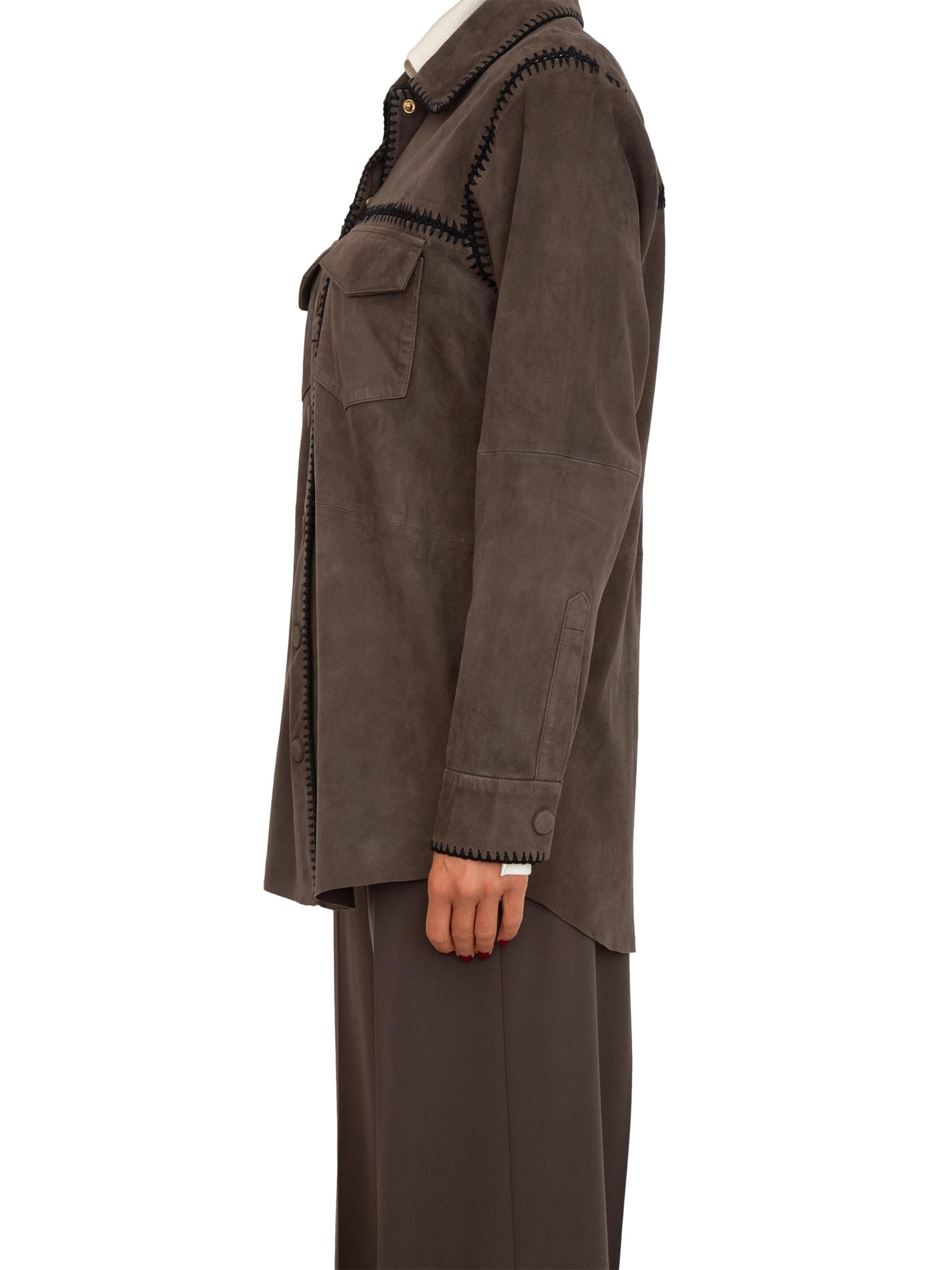 Ispirazione field jacket per la camicia in suede Blugirl con cuciture crochet fatte a mano che creano un elemento decorativo. Linea over, chiusura con bottoni ricoperti, maniche lunghe e tasche con patta. La modella è alta 1.72 e indossa la taglia 40.