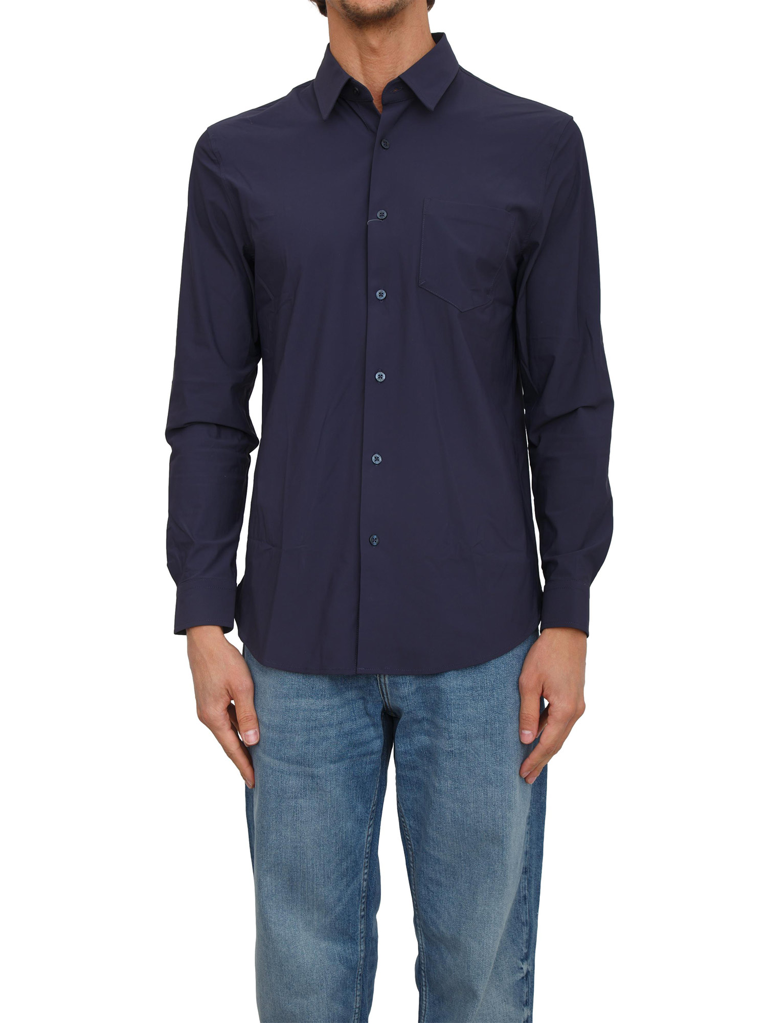 Camicia Guess Jeans uomo realizzata in cotone stretch con vestibilità slim. Collo classico, chiusura con bottoni tono su tono e tasca applicata sul petto. Il modello è alto 1.90m e indossa la taglia M.