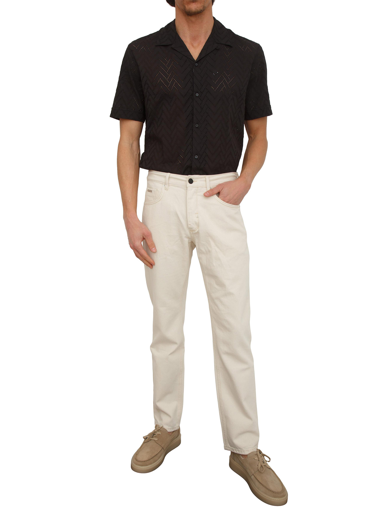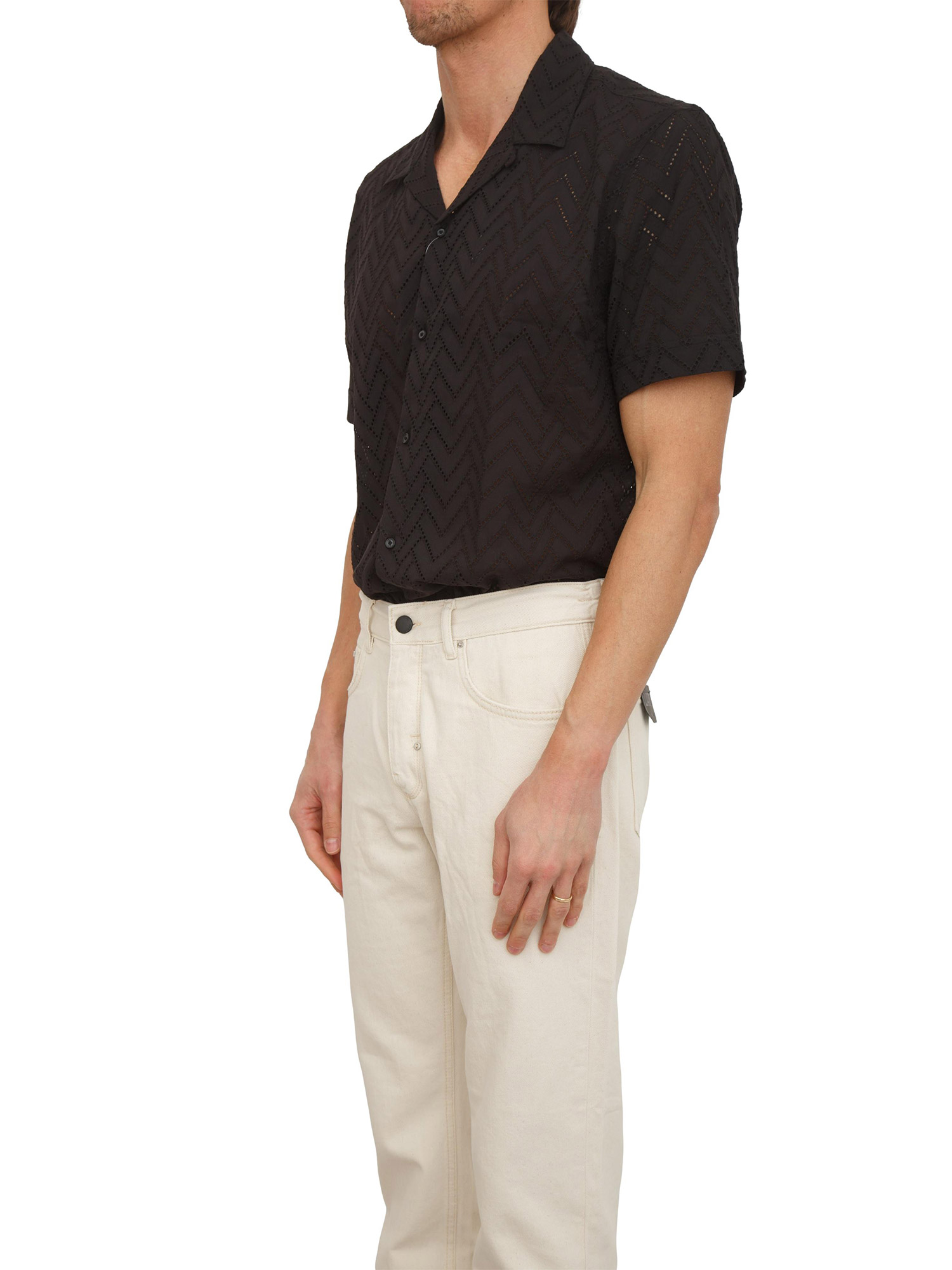 Camicia "Honolulu" Antony Morato realizzata in misto viscosa slub relaxed stright fit. Design a maniche corte con fantasia astratta che la rende perfetta per tutta l'estata. Da indossare da sola oppure sovrapposta ad una t-shirt. Il modello è alto 1.90m e indossa la taglia 48.