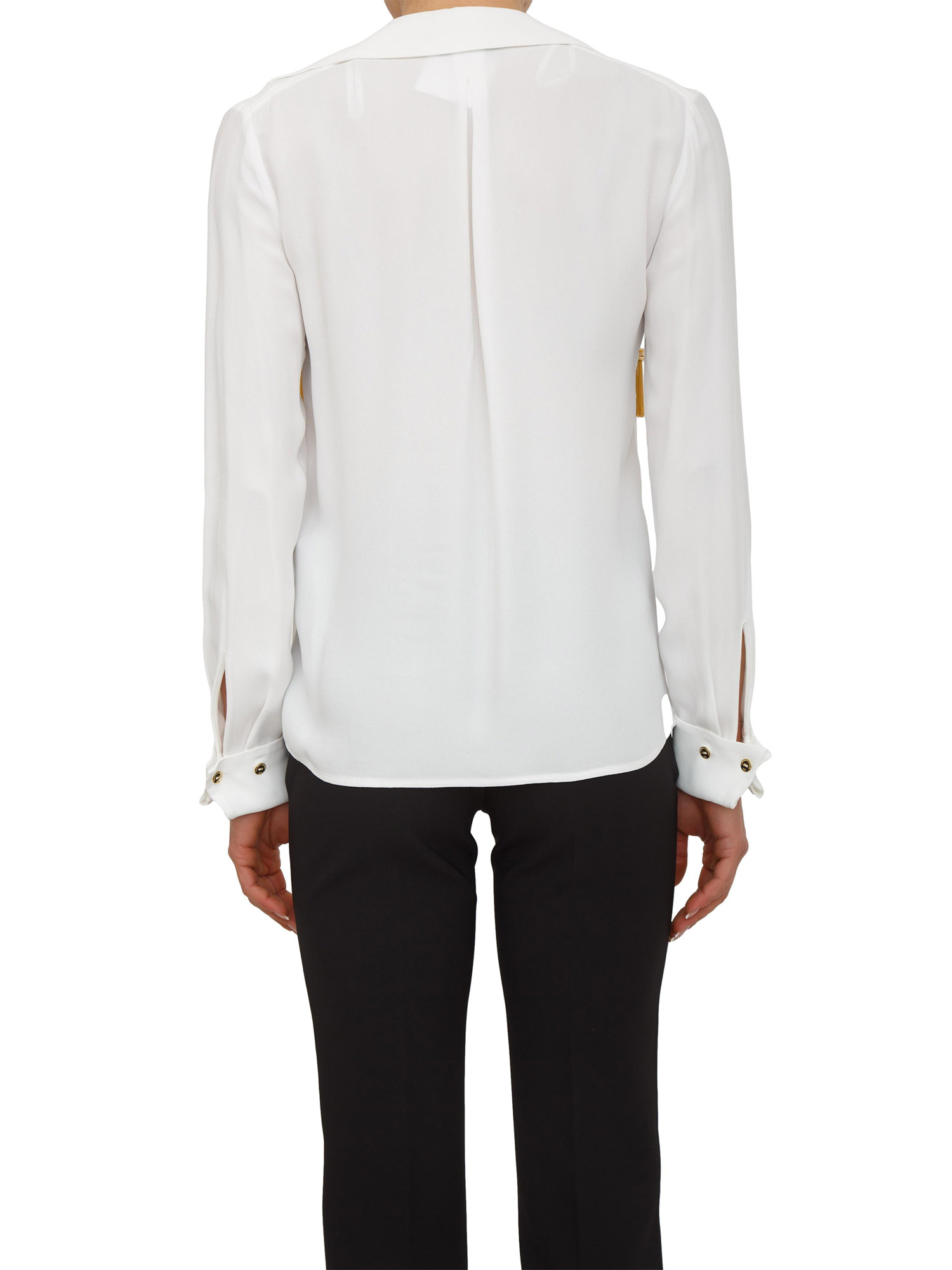 Camicia in georgette Elisabetta Franchi. Si distingue per il doppio colletto, arricchito dall'aggiunta di nappine gioiello per un gioco di luce e movimento. Le maniche sono impreziosite da bottoni in metallo dorato ispirati ai classici gemelli. Vestibilità regular. La modella è alta 1.72 e indossa la taglia 40.