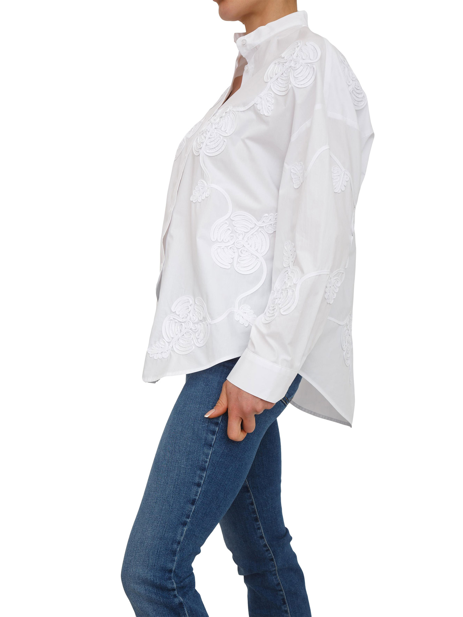 Camicia Liu Jo donna con ricamo cornelly che trasforma la superficie in un gioco di rilievi quasi scultorei. Fit oversize in popeline di cotone, collo coreano e ricami 3D. Per un fit più asciutto si consiglia di acquistare una taglia in meno rispetto a quella indossata abitualmente. La modella è alta 1.72 e indossa la taglia 40.